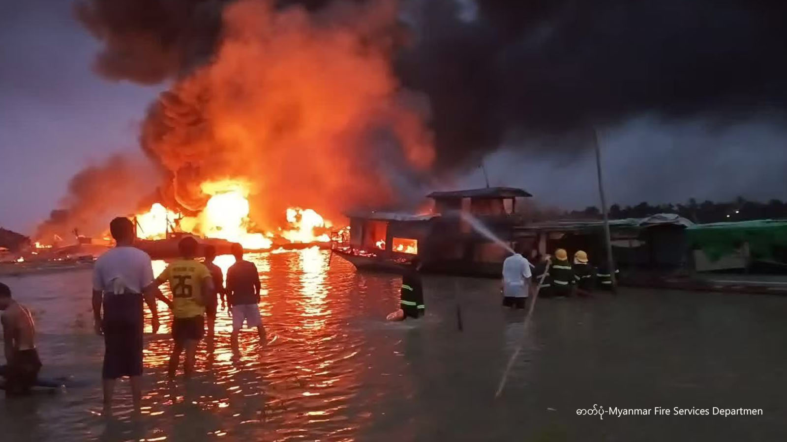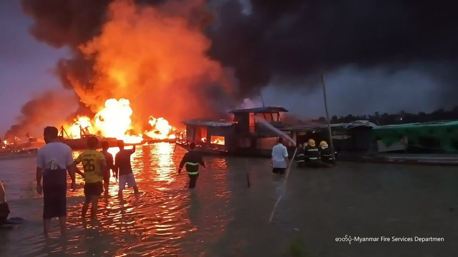 ဟုမ္မလင်း ဆိပ်ကမ်း၌ မီးလောင်နေသော စက်လှေအား မီးငြှိမ်းသတ်နေစဉ် (ဓာတ်ပုံ- မီးသတ်ဦးစီးဌာန)