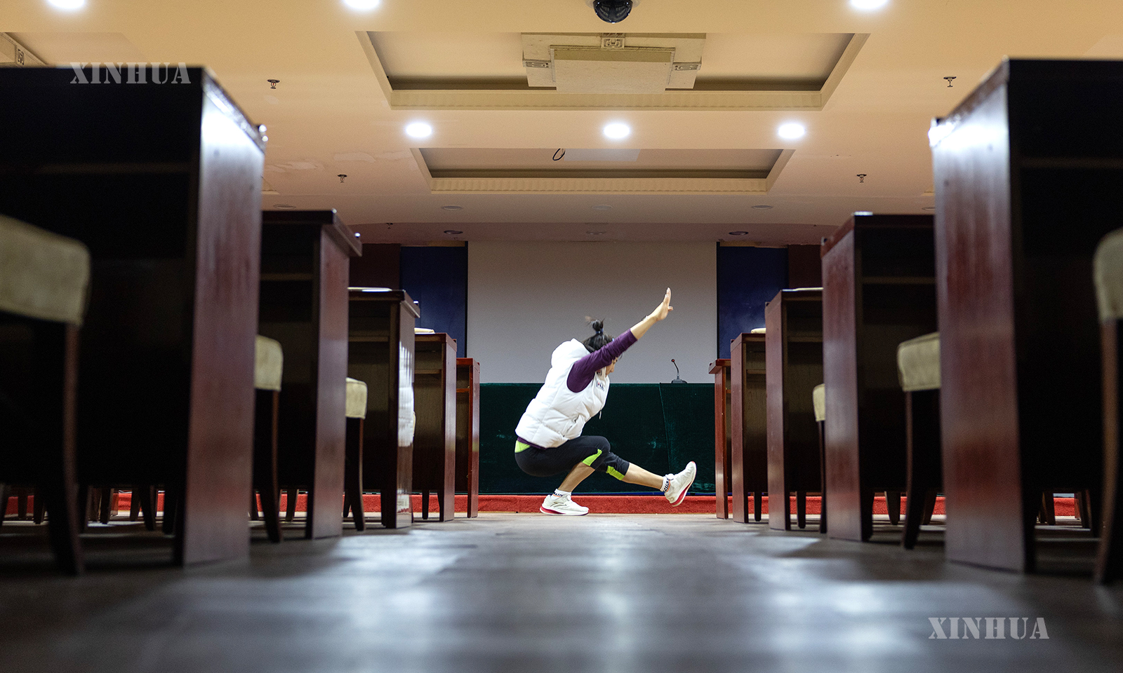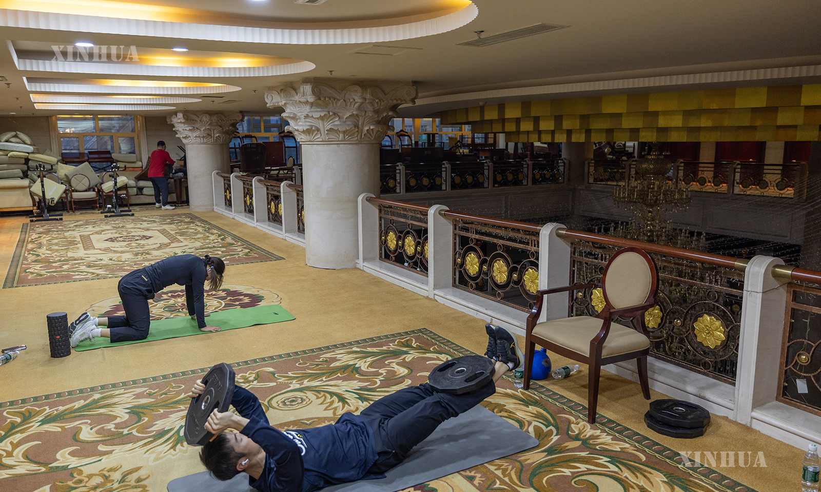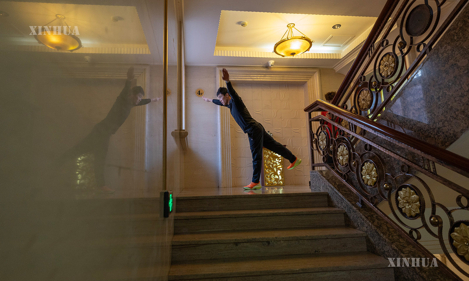 图说2:11月7日清晨,在宾馆走廊上,自由式滑雪空中技巧国家集训队队员李天马(前)和队友在进行拉伸。 新华社记者 费茂华 摄