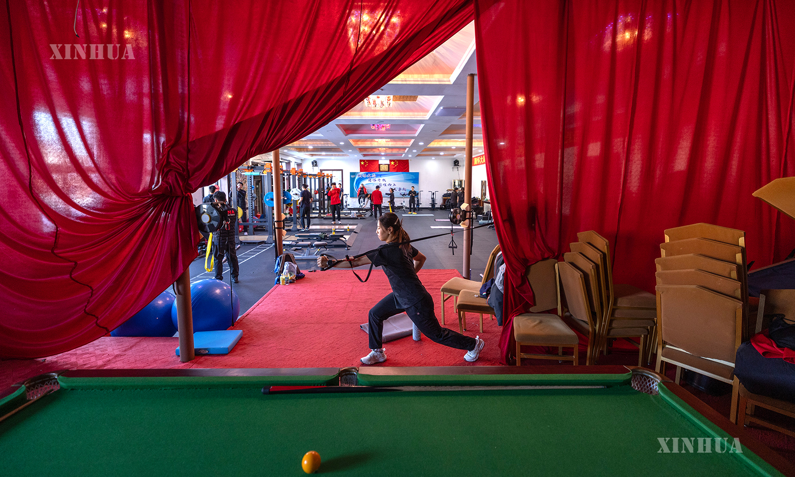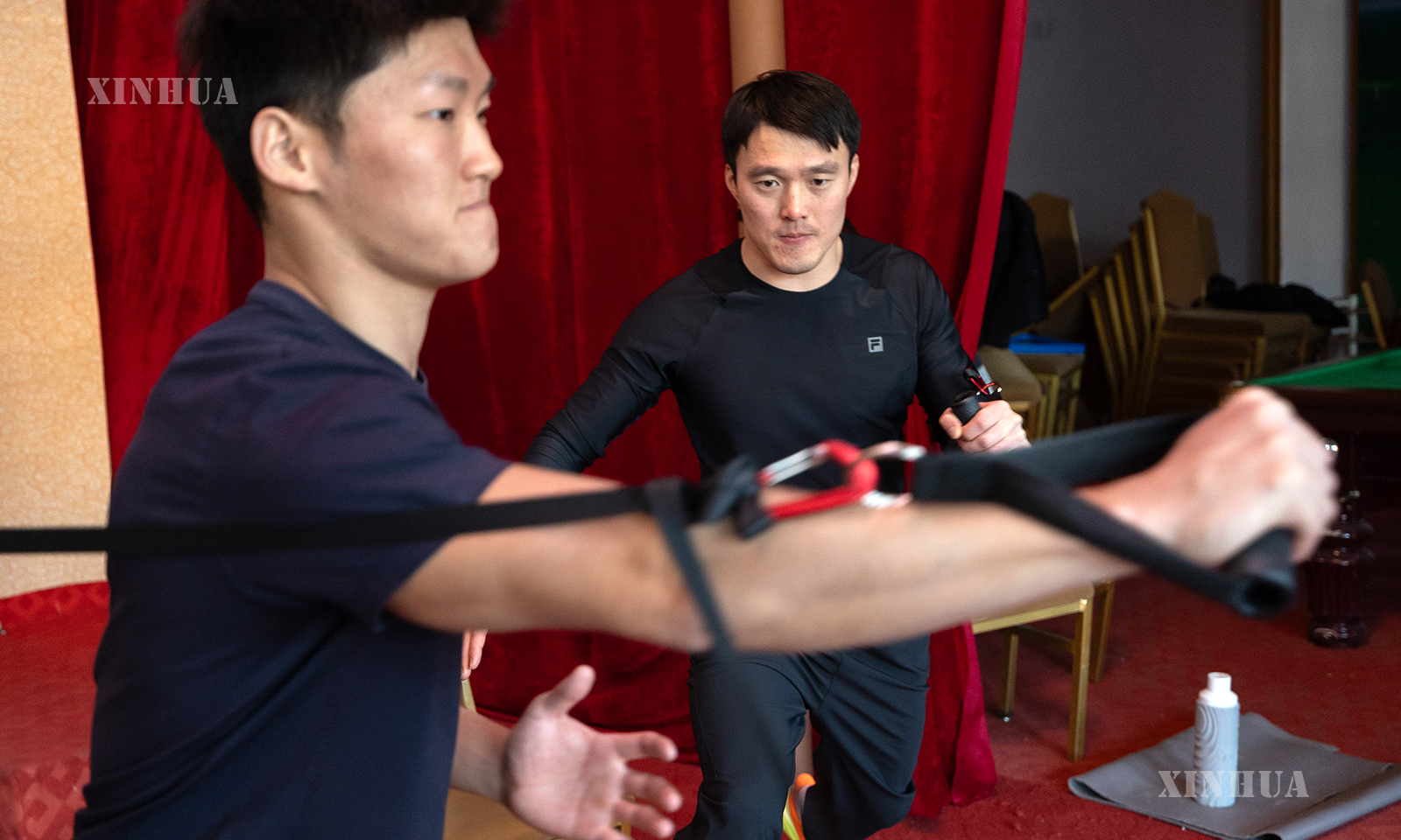队员们的日常训练通常从清晨开始,天光初亮,他们已经在宾馆的走廊、会议室甚至电梯间门口开始拉伸和热身训练。简单的早饭后,他们会来到雪场顶着寒风反复起跳、旋转、落地,专注打磨每一个动作细节。三个小时的空中动作技术训练结束后,队员们在下午来到宾馆附近由食堂改造成的临时体能训练馆进行体能、力量训练。体能教练根据每个队员的身体状态科学安排训练强度和项目,确保他们在完成核心力量、爆发力及柔韧性等训练的同时保持良好状态。晚饭后,队员们相继走进由宾馆房间临时改造的恢复区,随队医生、康复师将为他们进行理疗、按摩,帮助他们恢复体能。