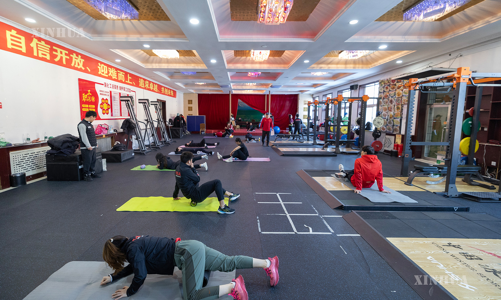 图说1:11月6日,在食堂改造而成的临时体能训练馆里,自由式滑雪空中技巧国家集训队队员邵琪(前)、孙佳旭(左一)和李天马(左二)在进行体能和力量训练。 新华社记者 费茂华 摄
