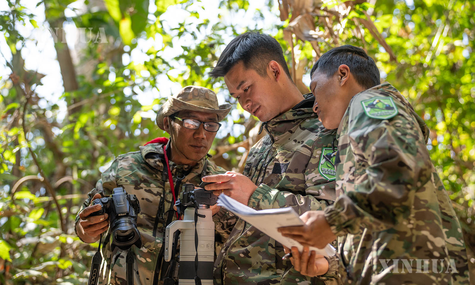 2、2月6日,“犀鸟巡护队”队员排忠华(左)、管能杰(中)与排新明在盈江县太平镇石梯村巡护期间记录犀鸟活动信息。新华社记者 高咏薇 摄