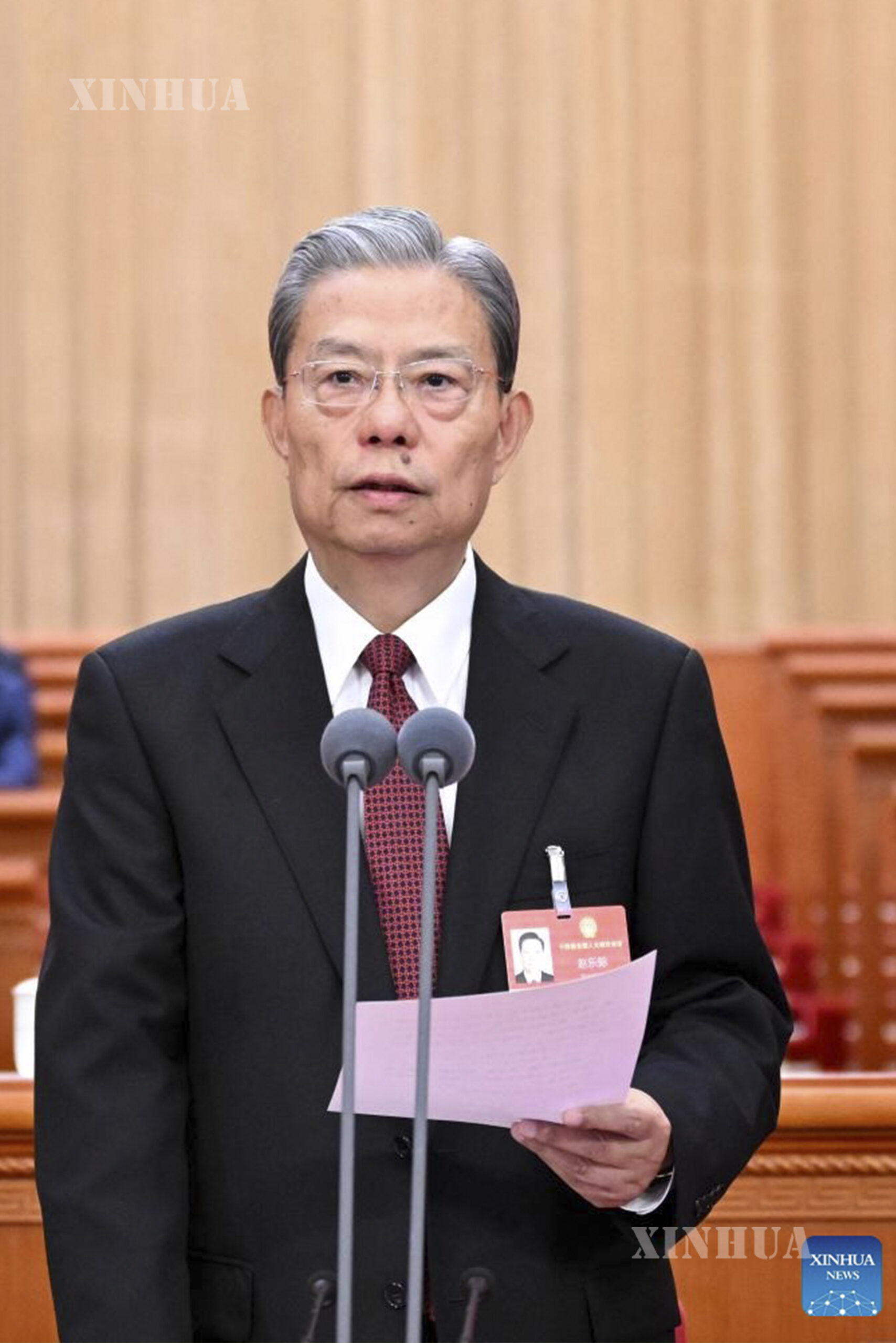 တရုတ်နိုင်ငံ မြို့တော်ပေကျင်းရှိ ပြည်သူ့ခန်းမဆောင်၌ ၁၄ ကြိမ်မြောက် တရုတ်ပြည်လုံးဆိုင်ရာ ပြည်သူ့ကွန်ဂရက် (NPC) စတုတ္ထအကြိမ် အစည်းအဝေး၏ အပိတ်အစည်းအဝေး၌ ကျောက်လဲ့ကျိ သဘာပတိအဖြစ် ကြီးမှူးကျင်းပနေပုံကို ၂၀၂၆ ခုနှစ် မတ် ၁၂ ရက်က တွေ့ရစဉ် (ဆင်ဟွာ)