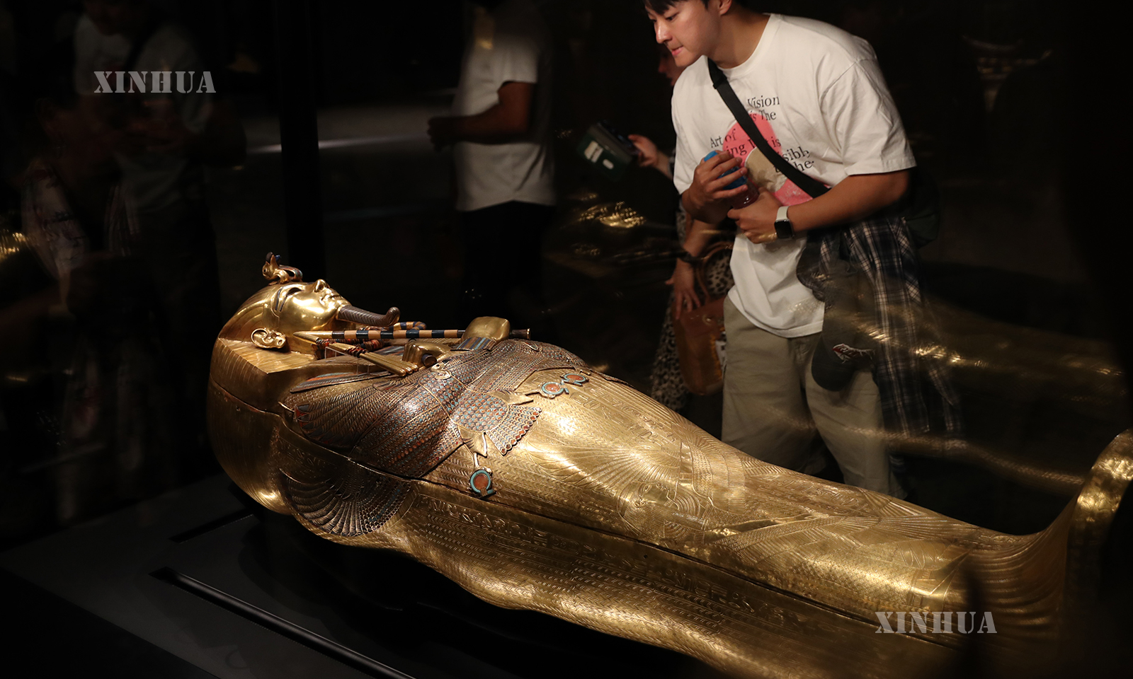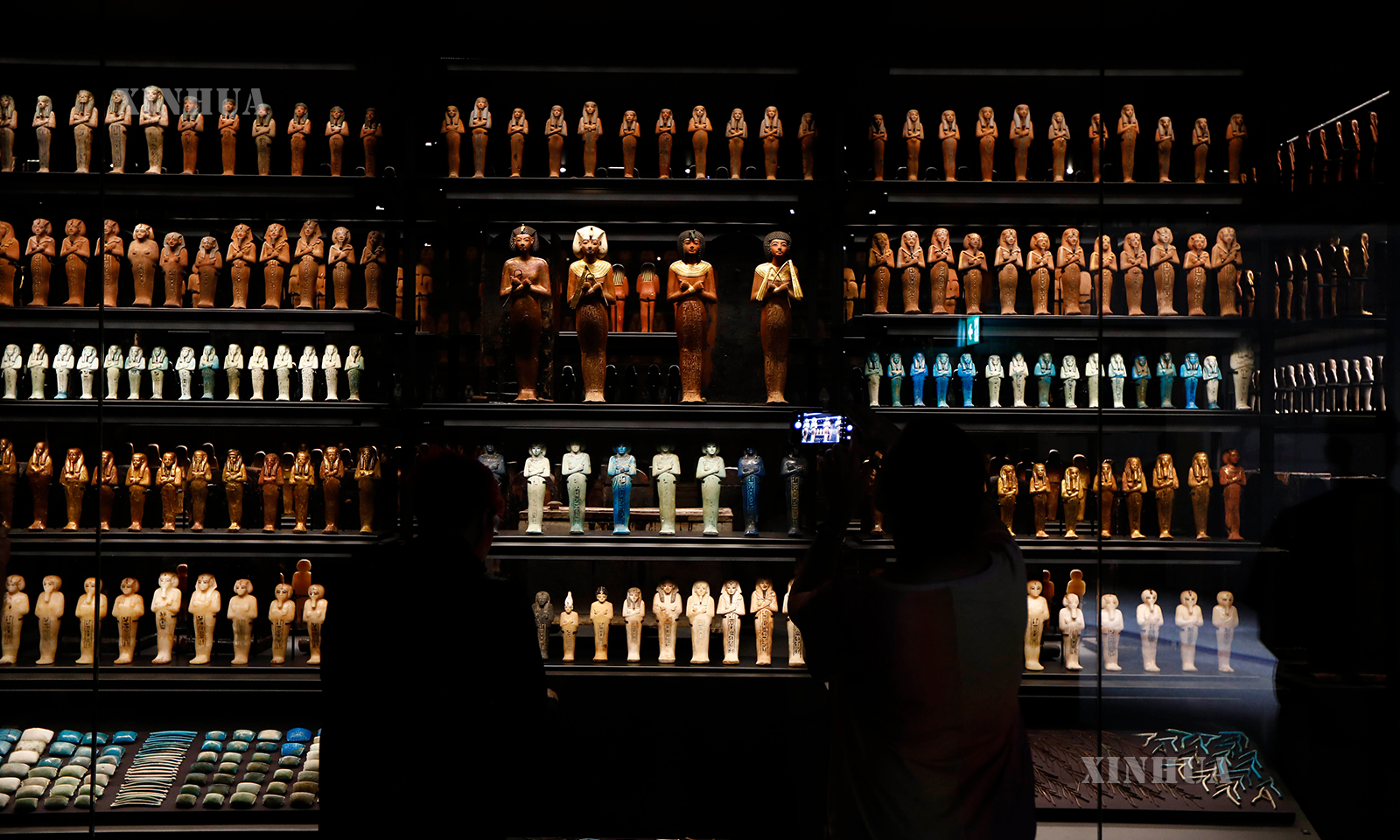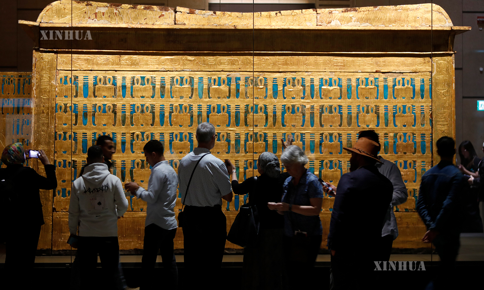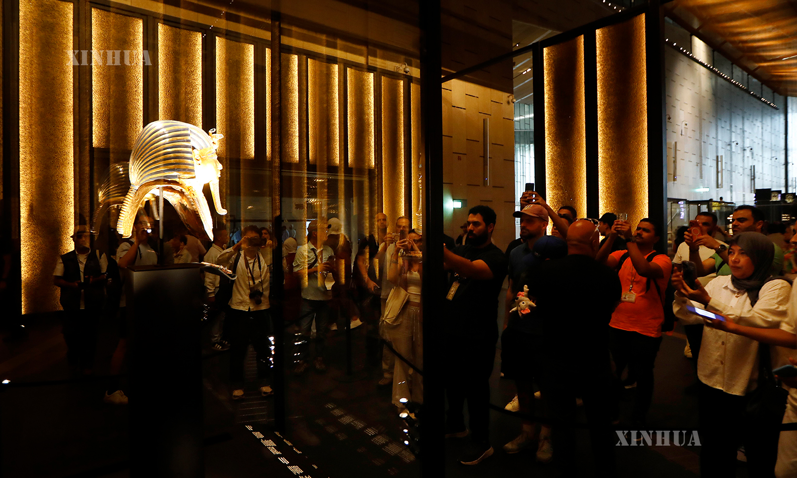 အီဂျစ်နိုင်ငံ Giza မြို့ရှိ မဟာအီဂျစ်ပြတိုက် (GEM) တွင် ရှေးခေတ်အီဂျစ် ဖာရိုဘုရင် Tutankhamun ပြခန်း၌ လှည့်လည်ကြည့်ရှုနေသော ခရီးသွားဧည့်သည်များအား အောက်တိုဘာ ၄ ရက်က တွေ့ရစဉ် (ဆင်ဟွာ)