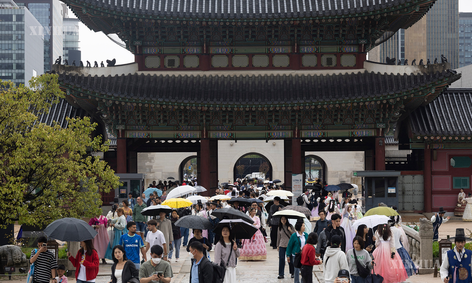 图说:10月5日,游客在韩国首尔的景福宫参观游览。新华社发(全休相摄)