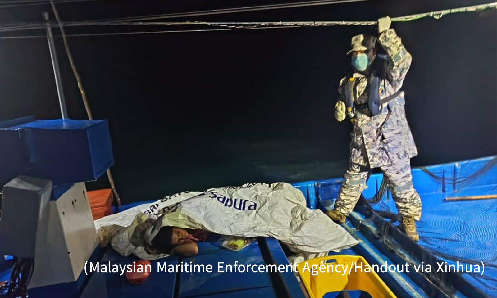 图说1:11月9日,在马来西亚吉打州附近海域,一名幸存者在甲板休息。新华社发(马来西亚海事执法局供图)