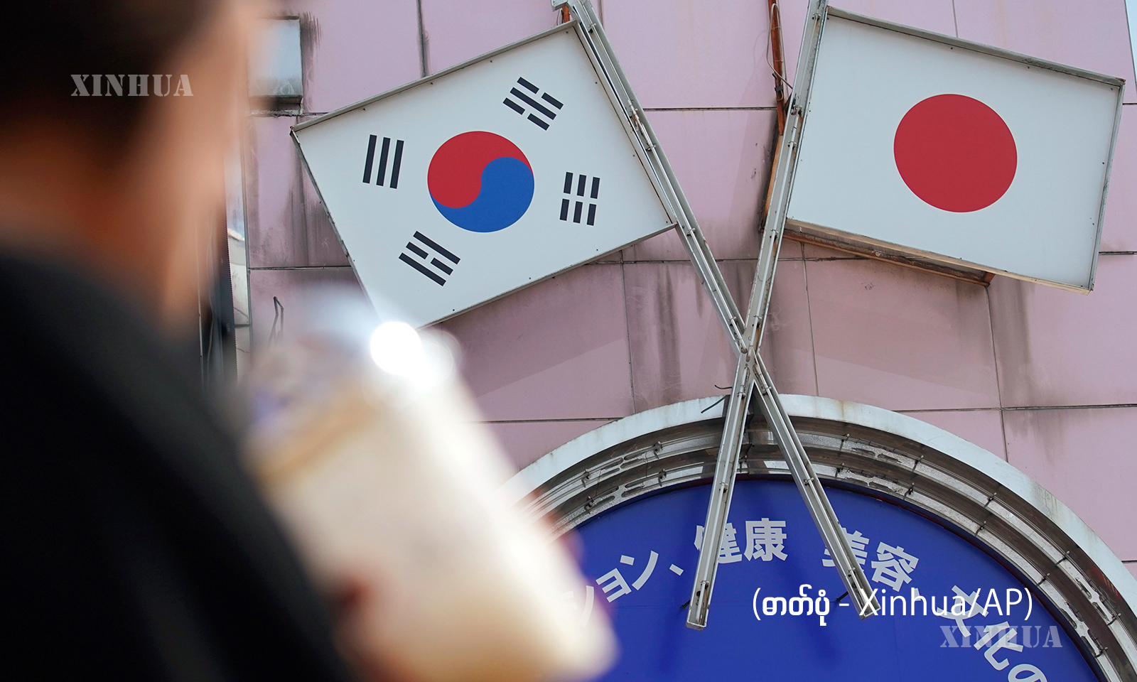 图说:2019年8月2日,在日本首都东京的新大久保,行人从标有日本和韩国国旗的广告牌前走过。新华社/美联