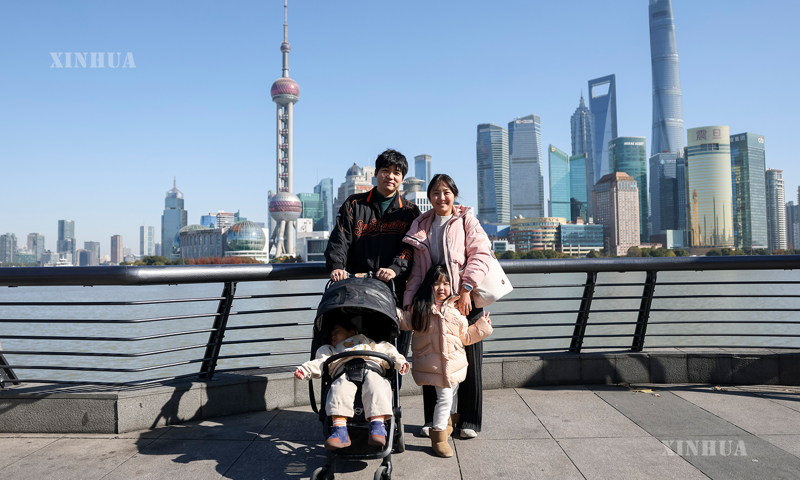 图说1:12月28日,韩国游客文鉉堣(左后)一家在上海外滩合影。他们在圣诞节来到上海并计划游玩5天。新华社记者 王翔 摄