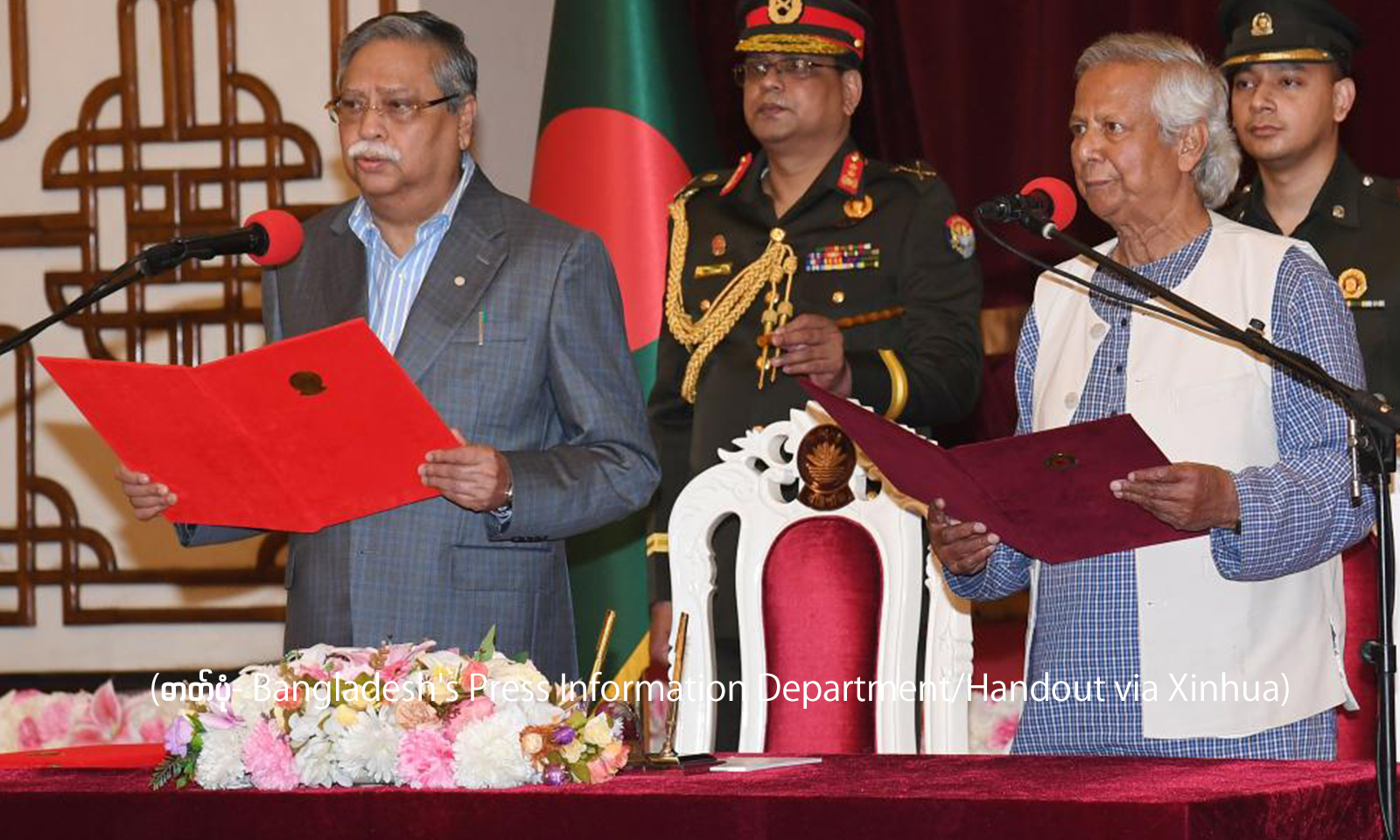 Bangladeshi economist Muhammad Yunus (R, front) takes oath as the head of the country’s interim government in Dhaka, Bangladesh, Aug. 8, 2024. (Bangladesh’s Press Information Department/Handout via Xinhua)