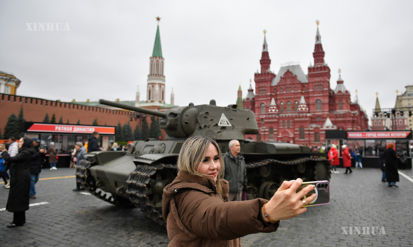 图说:11月7日,在俄罗斯首都莫斯科,人们在以纪念1941年苏联红场阅兵式为主题的露天展览上拍照。新华社发(亚历山大摄)
