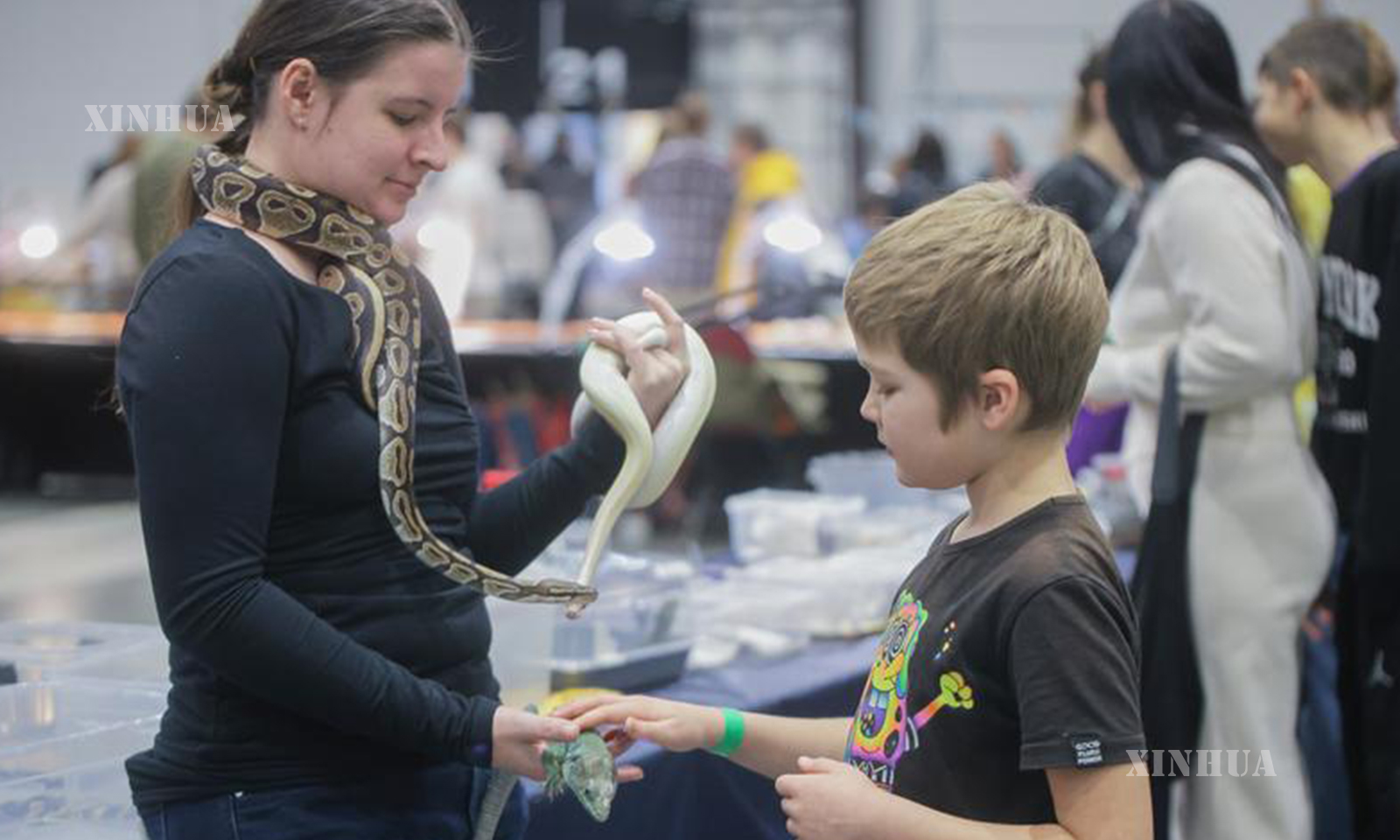 2. 12月14日,在俄罗斯圣彼得堡,一名男孩在“2025宠物秀”上触摸展出的宠物。新华社发(莫京娜摄)