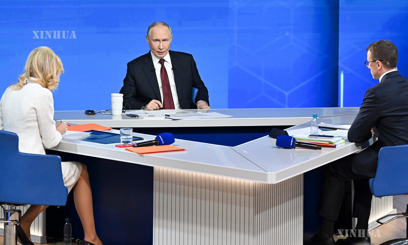 图说:12月19日,在俄罗斯首都莫斯科,俄罗斯总统普京(中)出席“年度盘点”活动。新华社记者 郝建伟 摄