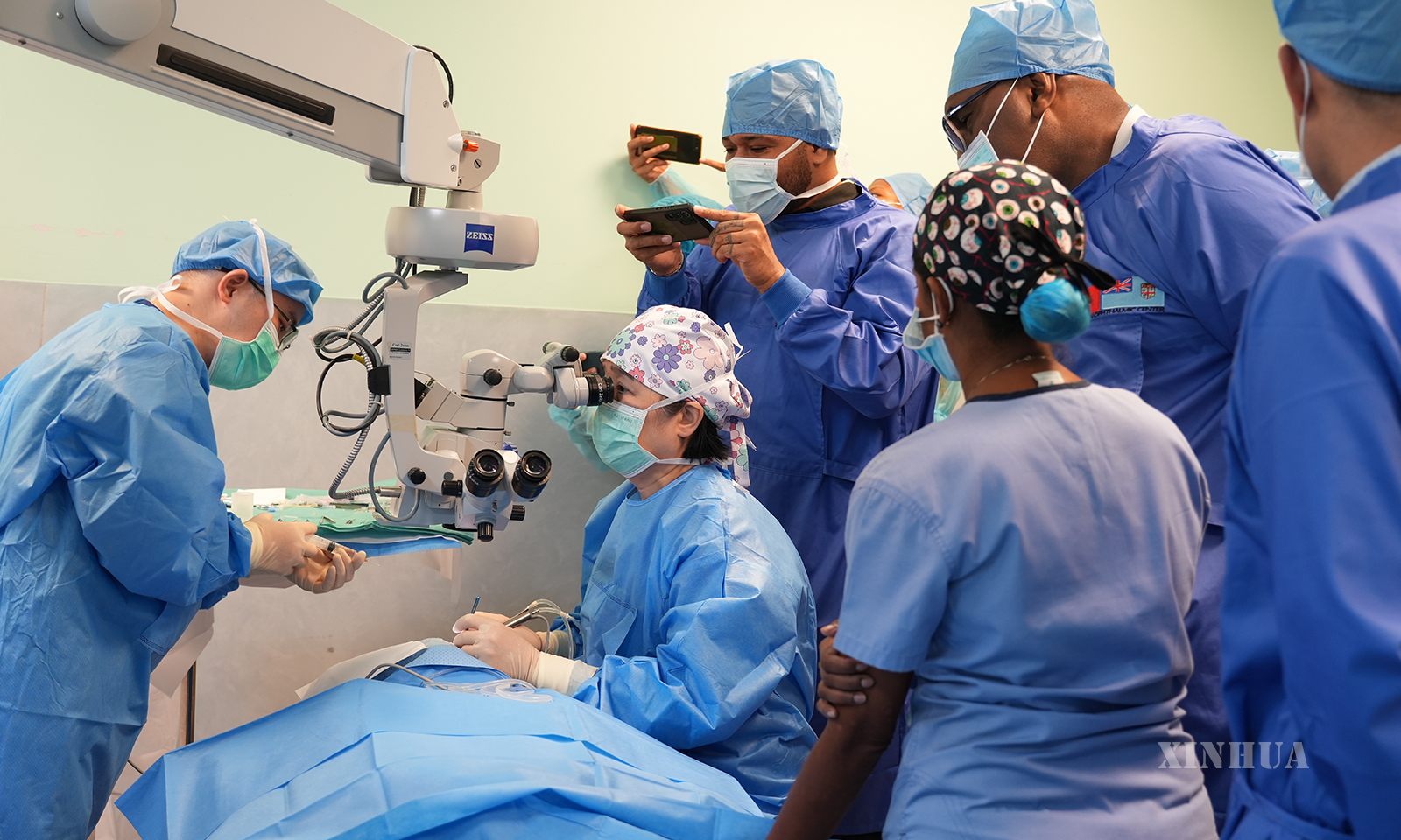 ဖီဂျီနိုင်ငံ မြို့တော်ဆူဗာရှိ ကိုလိုနီစစ်ပွဲအထိမ်းအမှတ်ဆေးရုံ၌ ပါမောက္ခ ချန်ဝေရုန်က အတွင်းတိမ်လူနာ ဗဲရိုမူလ်အား ခွဲစိတ်ကုသပေးနေသည်ကို ၂၀၂၅ ခုနှစ် နိုဝင်ဘာ ၇ ရက်က တွေ့ရစဉ် (ဆင်ဟွာ)