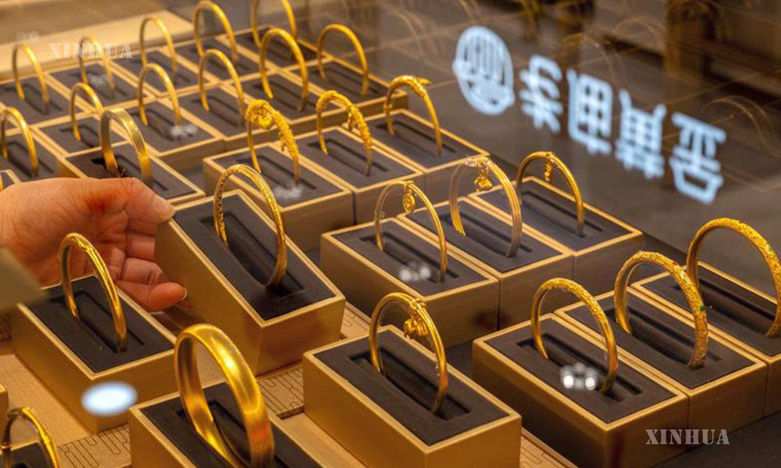 တရုတ်နိုင်ငံ ကျန်းဆူးပြည်နယ် လျန်ယွင်ကန်မြို့ လျန်ယွင်ခရိုင်ရှိ ရွှေဆိုင်တစ်ဆိုင်တွင် အရောင်းဝန်ထမ်းတစ်ဦးက ရွှေထည်ပစ္စည်းများ စီရီနေသည်ကို ၂၀၂၆ ခုနှစ် ဇန်နဝါရီ ၂၉ ရက်က တွေ့ရစဉ် (ဆင်ဟွာ)