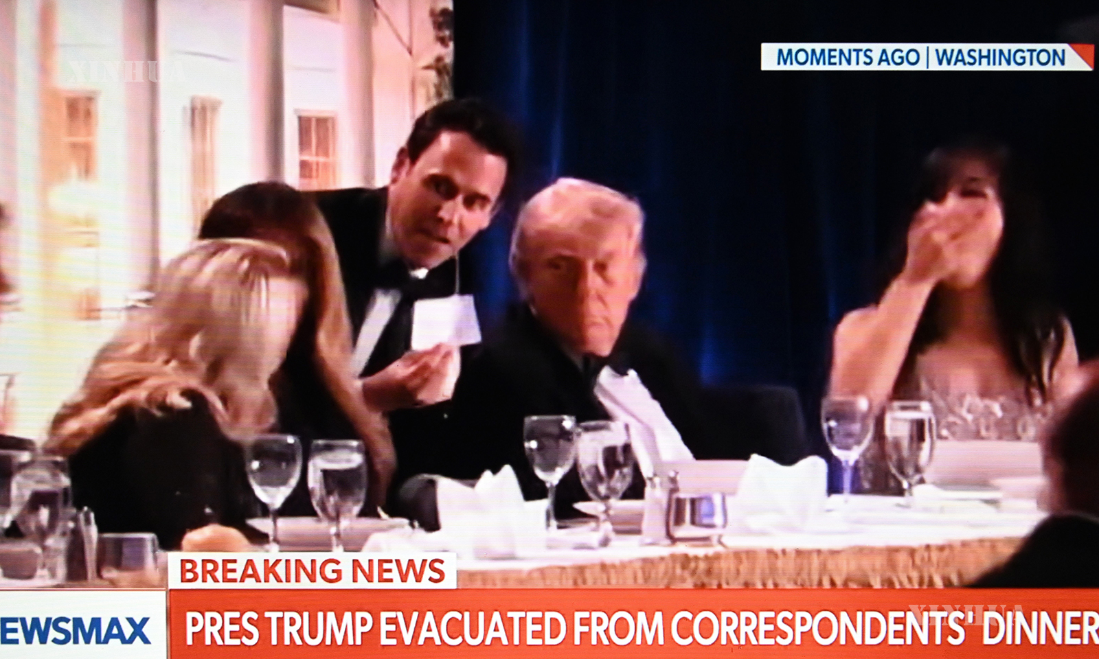 – အိမ်ဖြူတော်သတင်းထောက်များ ညစာစားပွဲ၌ လုံခြုံရေးချိုးဖောက်မှုဖြစ်စဉ် ဖြစ်ပွားပြီးနောက် ထရမ့်အား လုံခြုံရေးအစောင့်အရှောက်ဖြင့် ခေါ်ထုတ်ခဲ့ရ၊ သေနတ်သမားကို ဖမ်းမိထား