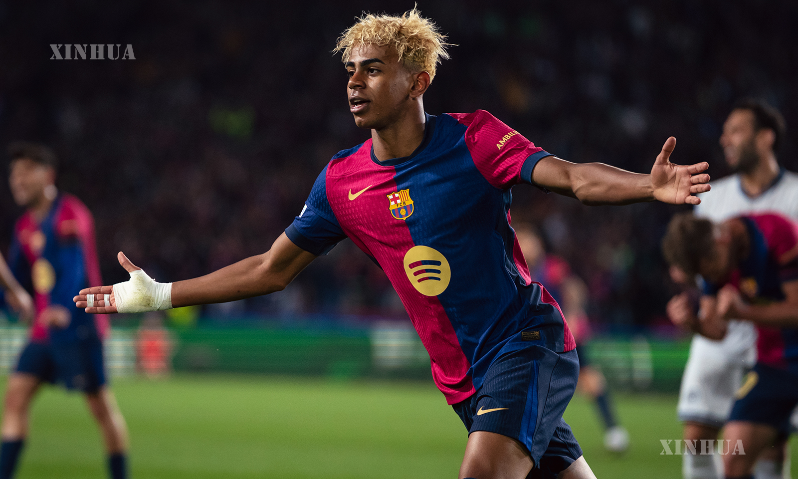 Lamine Yamal of FC Barcelona celebrates a goal during the UEFA Champions League semifinal 1st leg between FC Barcelona and Inter Milan in Barcelona, Spain, April 30, 2025. (Photo by Joan Gosa/Xinhua)