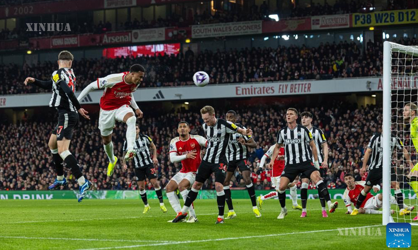 Photo : Arsenal’s Gabriel Magalhaes (2nd L) heads the ball to shoot during the English Premier League match between Arsenal and Newcastle United in London, Britain, Feb. 24, 2024. (Xinhua)