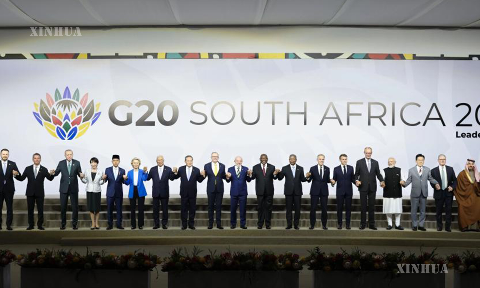 အားလုံးလက်ခံပါဝင်မှုရှိ၍ စဉ်ဆက်မပြတ်ဖြစ်သော စီးပွားရေးဖွံ့ဖြိုးတိုးတက်မှုအတွက် အဓိက ဦးတည်ဆွေးနွေးရန် တောင်အာဖရိကနိုင်ငံ ဂျိုဟန်းနက်စ်ဘာ့ဂ်မြို့တွင် ကျင်းပလျက်ရှိသည့် ၂၀ ကြိမ်မြောက် G20 ထိပ်သီးအစည်းအဝေး အဖွင့်အစည်းအဝေးသို့ တက်ရောက်လာသော နိုင်ငံ့ခေါင်းဆောင်များ အမှတ်တရစုပေါင်းဓာတ်ပုံ ရိုက်ကူးနေသည်ကို ၂၀၂၅ ခုနှစ် နိုဝင်ဘာ ၂၂ ရက်က တွေ့ရစဉ် (ဆင်ဟွာ)