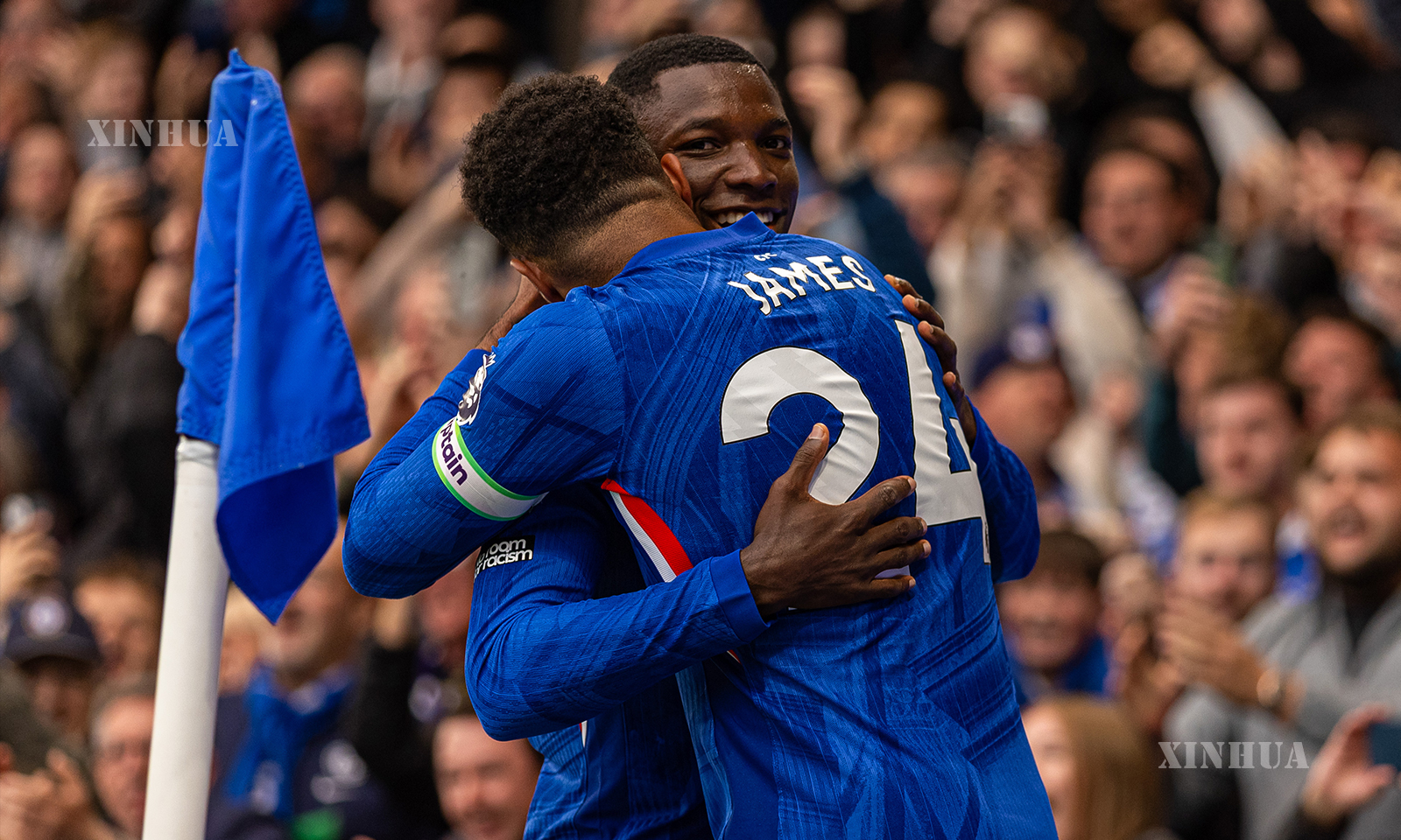 Chelsea’s Moises Caicedo (rear) celebrates after scoring the opening goal during the English Premier League match between Chelsea FC and Liverpool FC in London, Britain, on Oct. 4, 2025. (Xinhua)