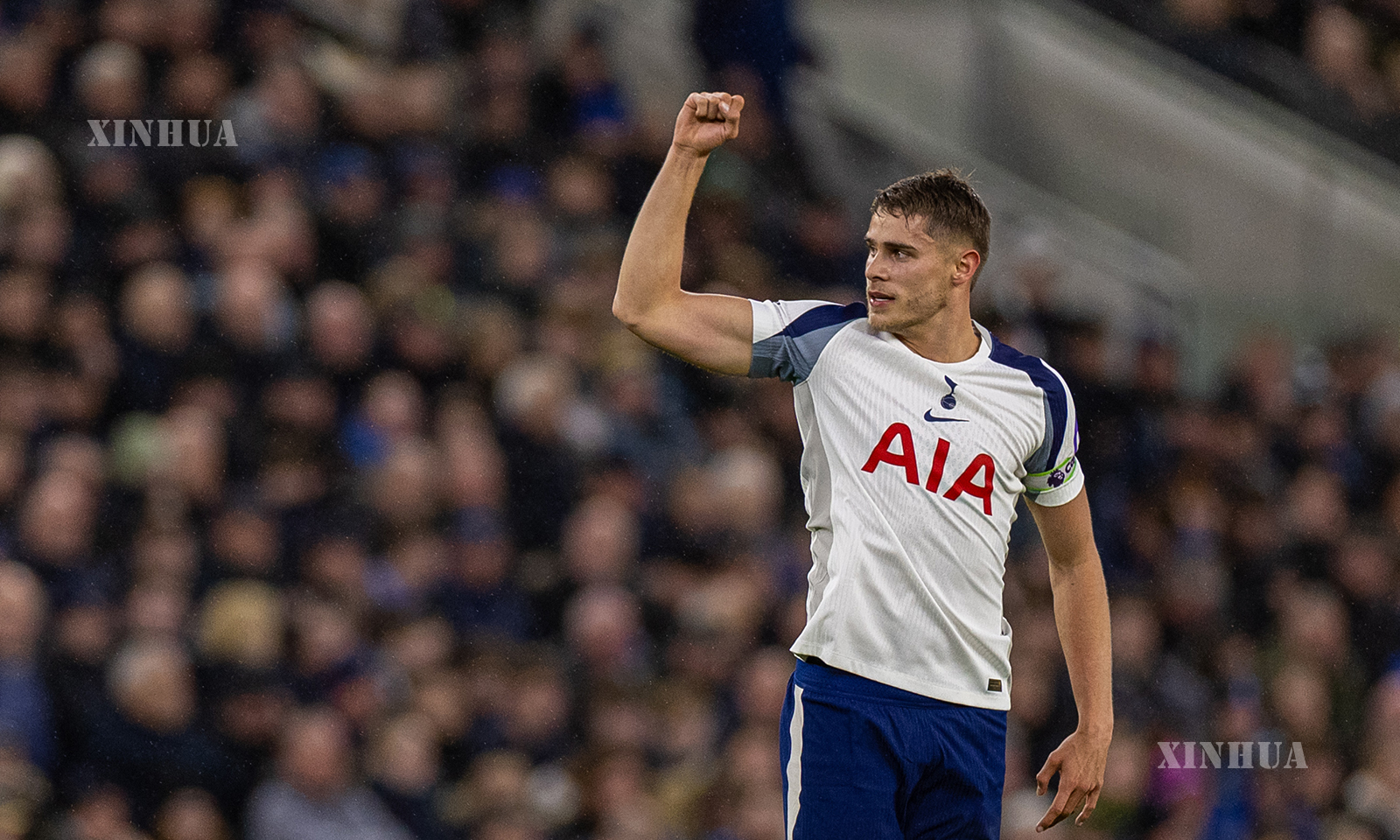 Tottenham Hotspur’s Micky van de Ven celebrates after scoring the first goal during the English Premier League match between Everton FC and Tottenham Hotspur FC in Liverpool, Britain, on Oct. 26, 2025. (Xinhua)