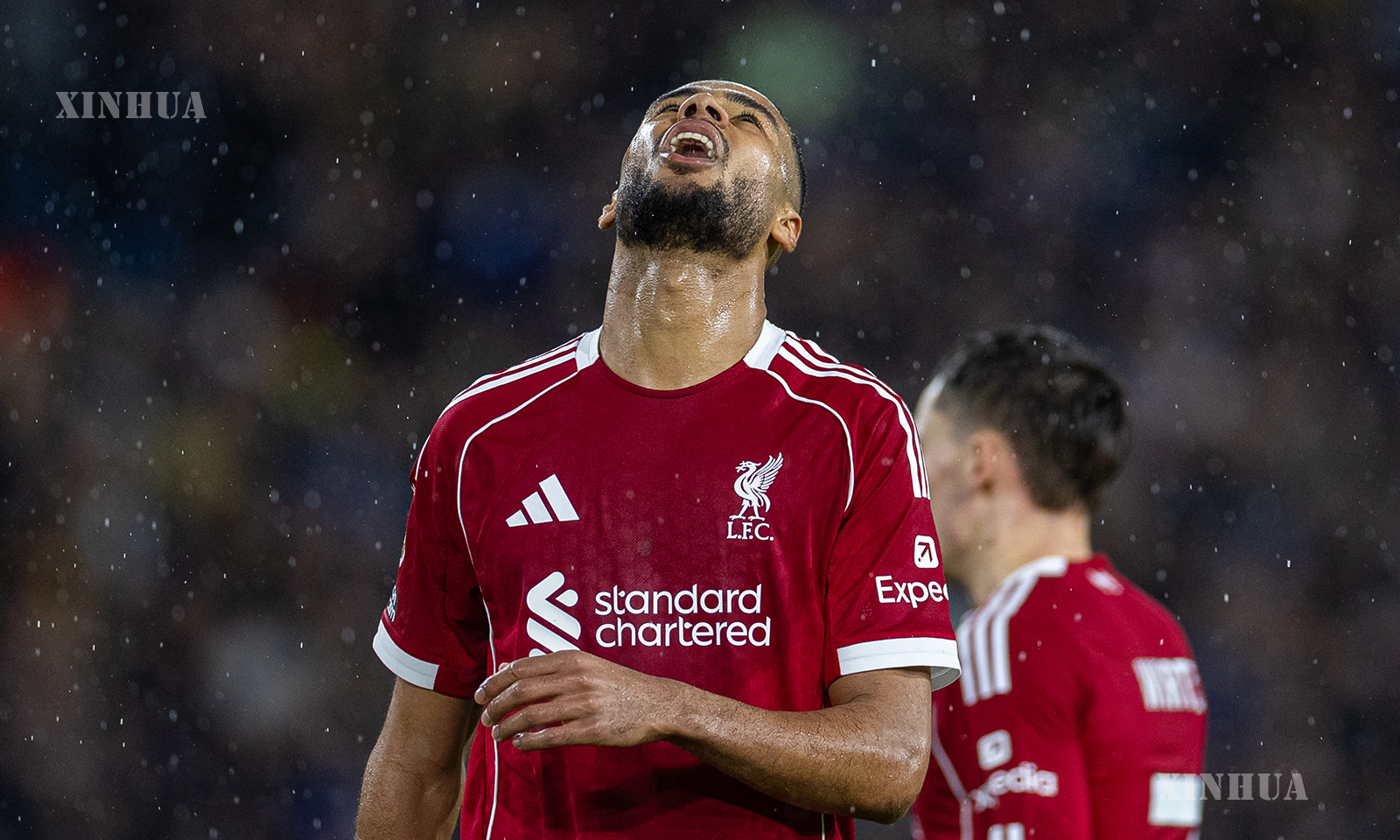 Liverpool’s players react after Leeds United’s equalising third goal during the English Premier League match between Leeds United and Liverpool in Leeds, Britain, on Dec. 6, 2025. (Xinhua)