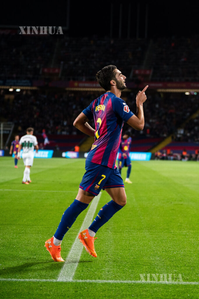 Ferran Torres of FC Barcelona celebrates his goal during the Laliga football match between FC Barcelona and Elche CF at Olimpico Lluis Companys Stadium in Barcelona, Spain, on Nov. 2, 2025. (Photo by Joan Gosa/Xinhua)