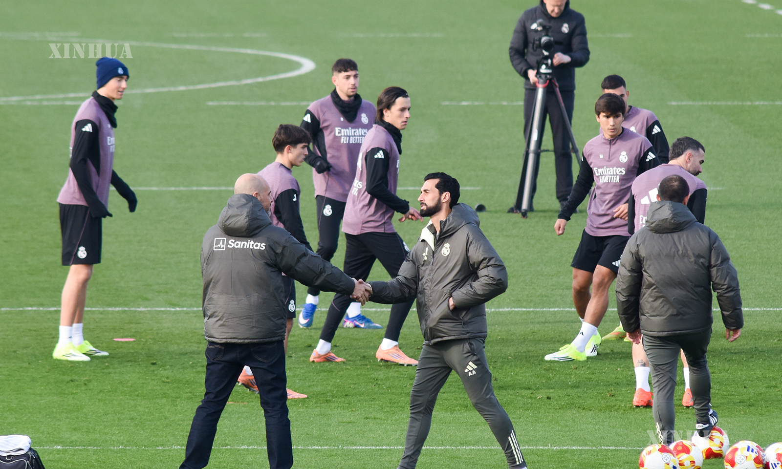 Real Madrid’s new coach Alvaro Arbeloa (3rd R) attends a training session after the Xabi Alonso’s displacement at Real Madrid Sports City in Valdebebas, in the outskirts of Madrid, Jan. 13, 2026. (Photo by Gustavo Valiente/Xinhua)