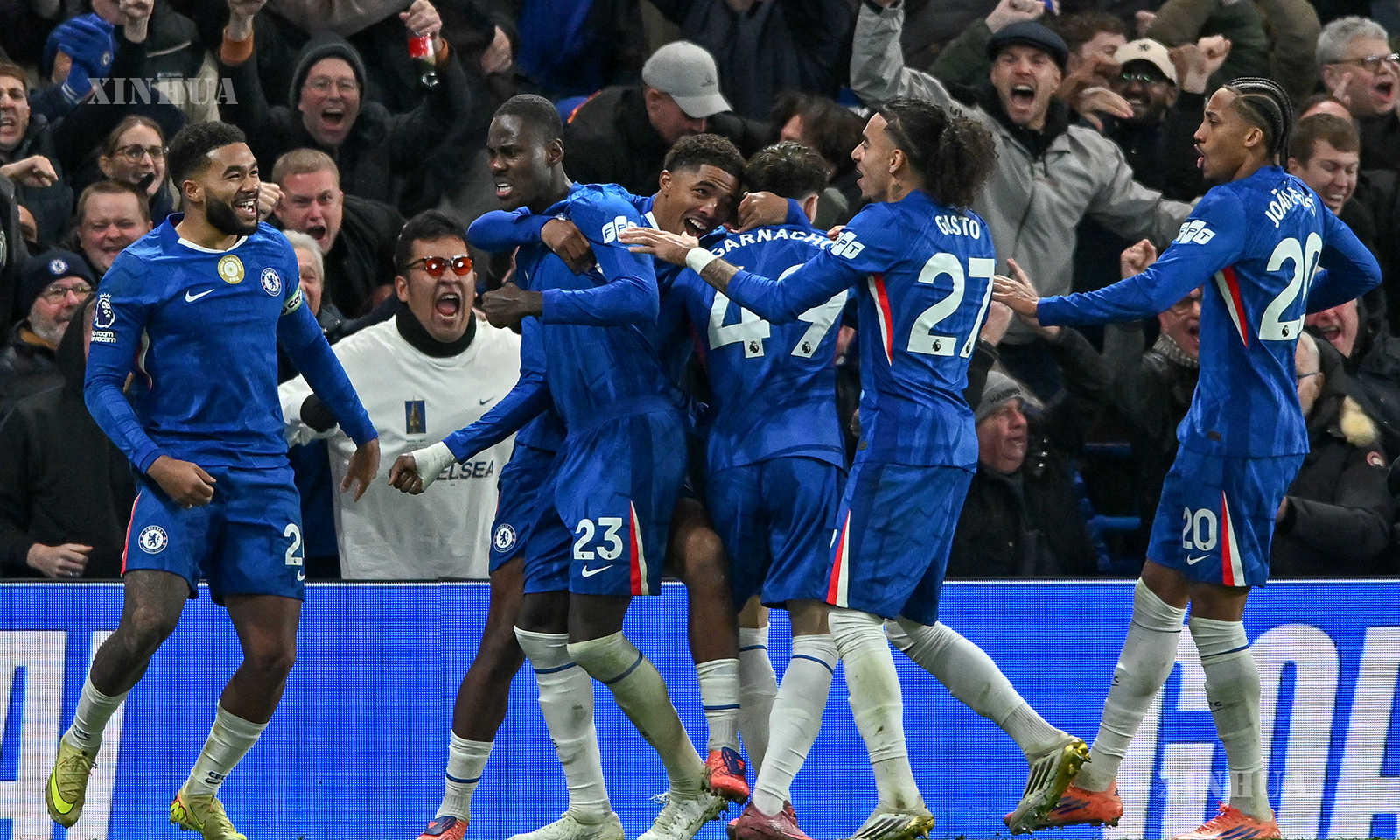 Trevoh Chalobah of Chelsea celebrates scoring with teammates during the English Premier League match between Arsenal FC and Chelsea FC in London, Britain, on Nov. 30, 2025. (Xinhua)