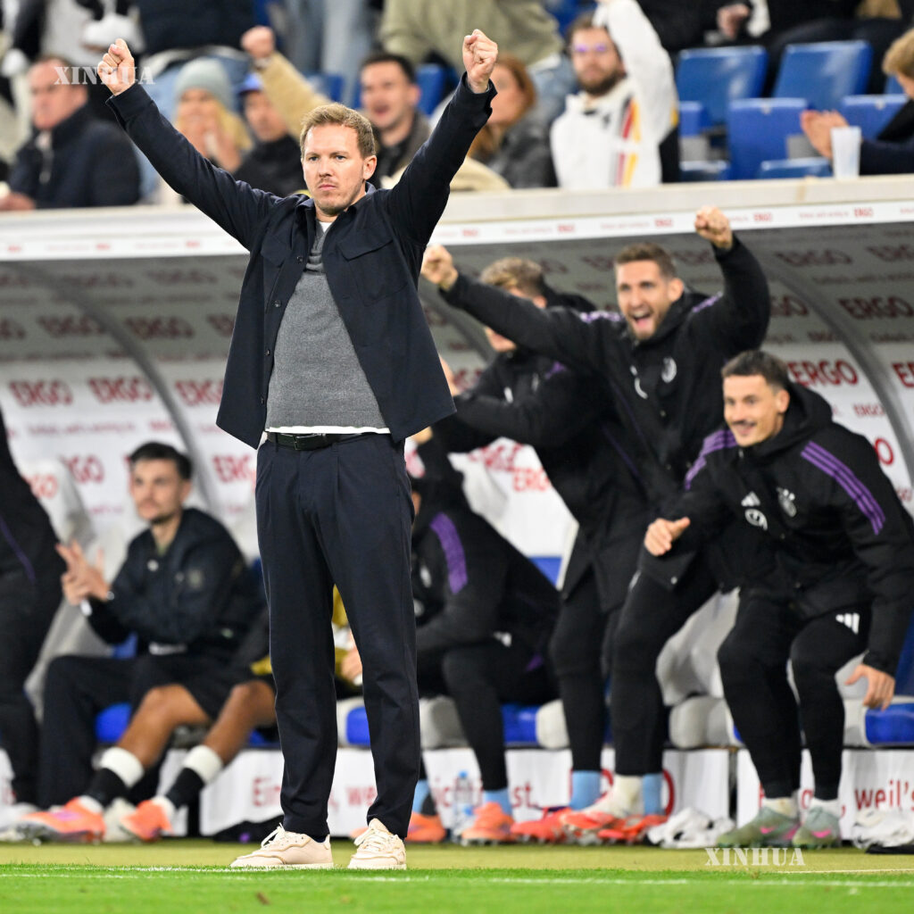 Julian Nagelsmann, head coach of Germany, celebrates during the 2026 World Cup European Qualifiers football match between Germany and Luxembourg in Sinsheim, Germany, Oct. 10, 2025. (Photo by Ulrich Hufnagel/Xinhua)