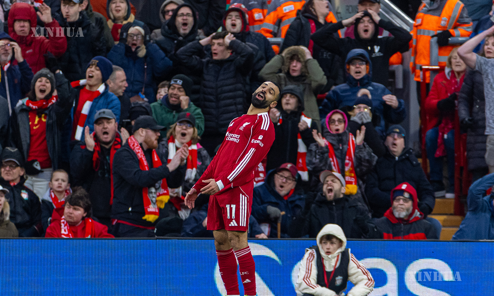 Liverpool’s Mohamed Salah reacts after missing a chance during the English Premier League match between Liverpool FC and Tottenham Hotspur FC in Liverpool, Britain, on March 15, 2026. (Xinhua)