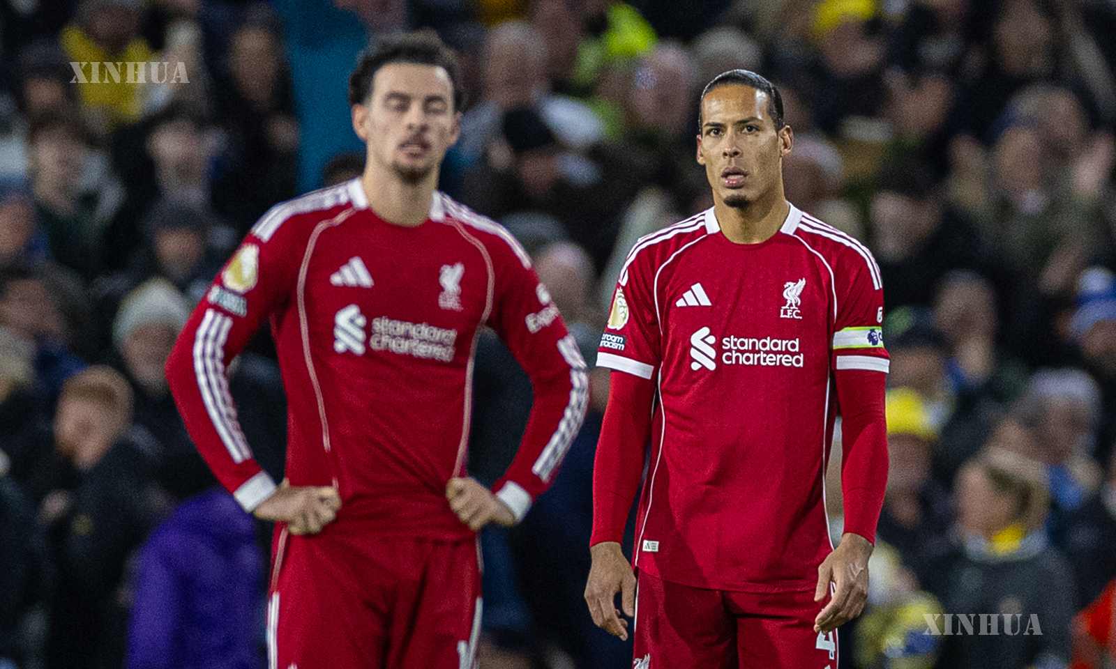 Liverpool’s captain Virgil van Dijk (R) reacts after Leeds United scores during the English Premier League match between Leeds United and Liverpool in Leeds, Britain, on Dec. 6, 2025. (Xinhua)
