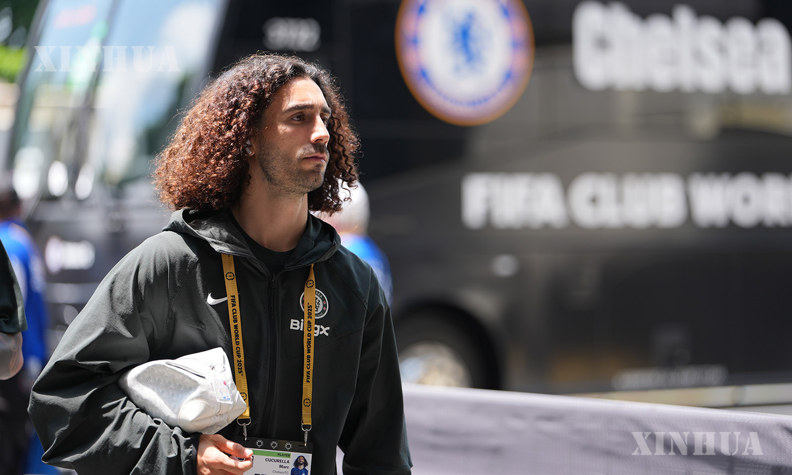 အမေရိကန်နိုင်ငံ ရှားလော့မြို့ရှိ Bank of America အားကစားကွင်း၌ ၂၀၂၅ ခုနှစ် ဇွန် ၂၈ ရက်က ပေါ်တူဂီကလပ် ဘင်ဖီကာအသင်းနှင့် အင်္ဂလန်ကလပ် ချဲလ်ဆီးအသင်းတို့ ယှဉ်ပြိုင်ကစားသည့် ၂၀၂၅ ဖီဖာကလပ်ကမ္ဘာ့ဖလား ၁၆ သင်းအဆင့်ပွဲစဉ်မတိုင်မီ ချဲလ်ဆီးအသင်းမှ မာ့ခ် ကူကူရယ်လာ ရောက်ရှိလာပုံကို တွေ့ရစဉ် (ဆင်ဟွာ)