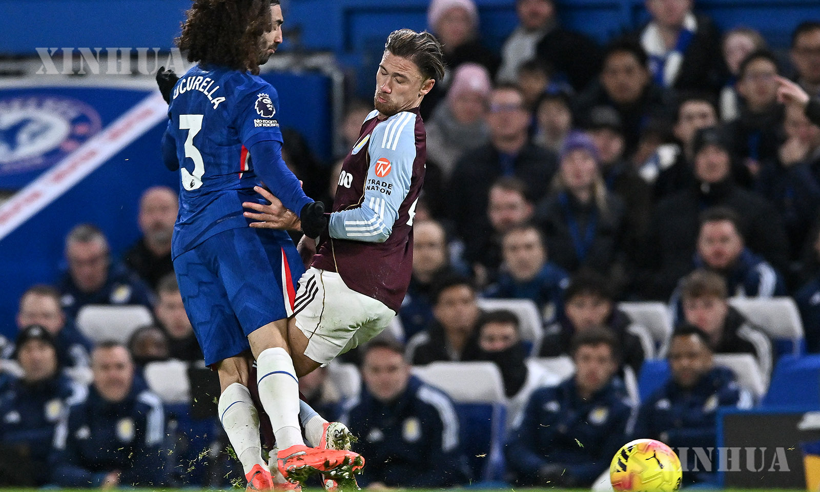 Marc Cucurella (L) of Chelsea battles with Matty Cash of Aston Villa during the English Premier League match between Chelsea and Aston Villa in London, Britain, Dec. 27, 2025. (Xinhua)