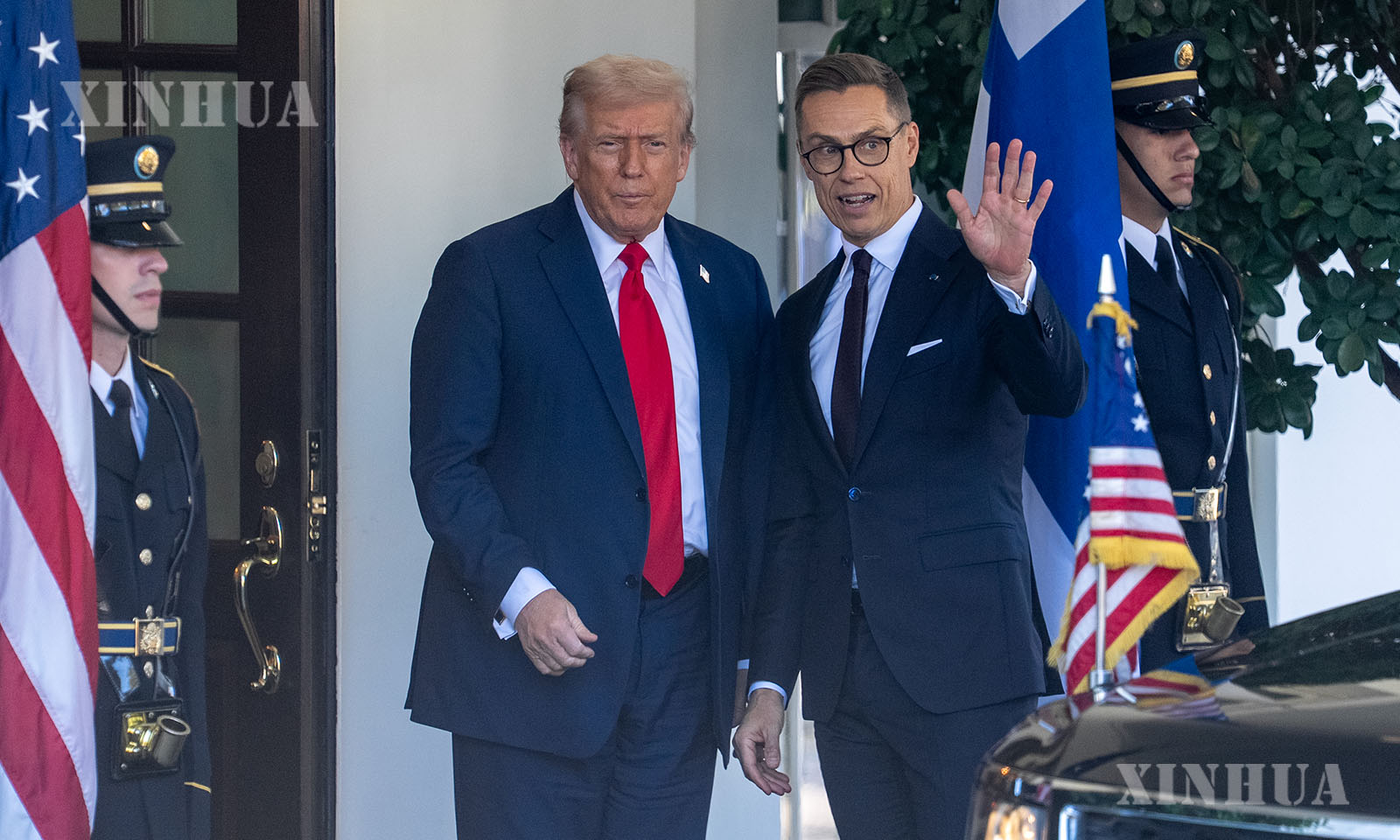 图说:10月9日,在美国首都华盛顿白宫,美国总统特朗普(中左)欢迎到访的芬兰总统斯图布。新华社记者 胡友松 摄