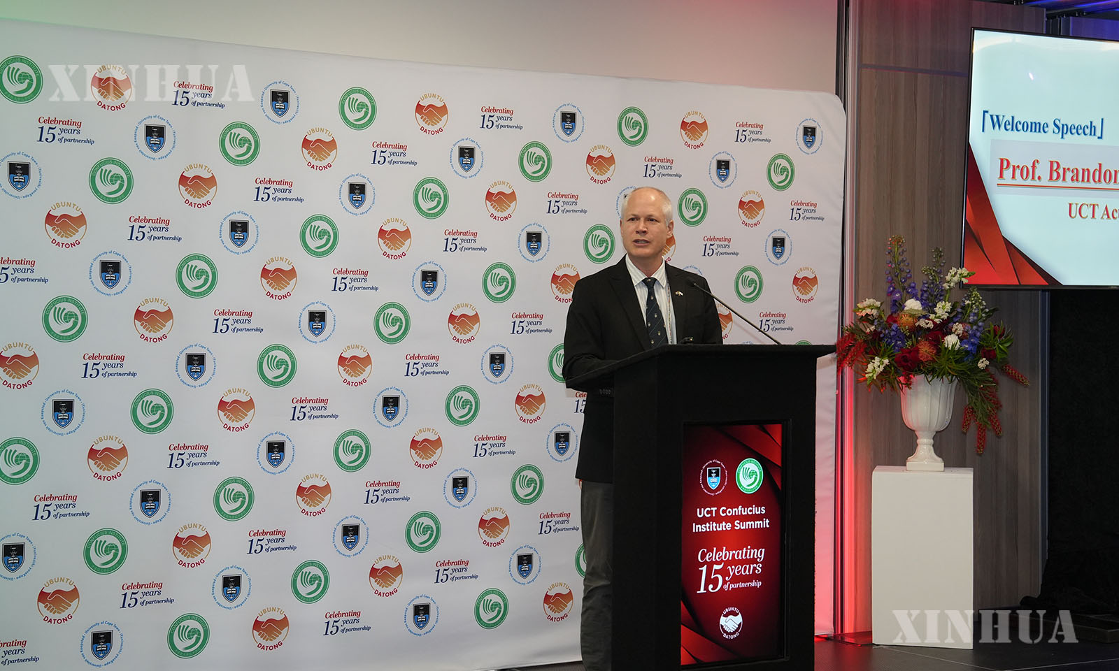 တောင်အာဖရိကနိုင်ငံ ကိပ်တောင်းမြို့၌ ကျင်းပသည့် ကိပ်တောင်းတက္ကသိုလ် ကွန်ဖြူးရှပ် အင်စတီကျု ဖွင့်လှစ်ခြင်း ၁၅ နှစ်ပြည့် ဂုဏ်ပြုအခမ်းအနား၌ အမှာစကားပြောကြားနေသော ကိပ်တောင်းတက္ကသိုလ် ယာယီပါမောက္ခချုပ် Brandon Collier-Reed အား ၂၀၂၅ ခုနှစ် အောက်တိုဘာ ၉ ရက်က တွေ့ရစဉ် (ဆင်ဟွာ)
