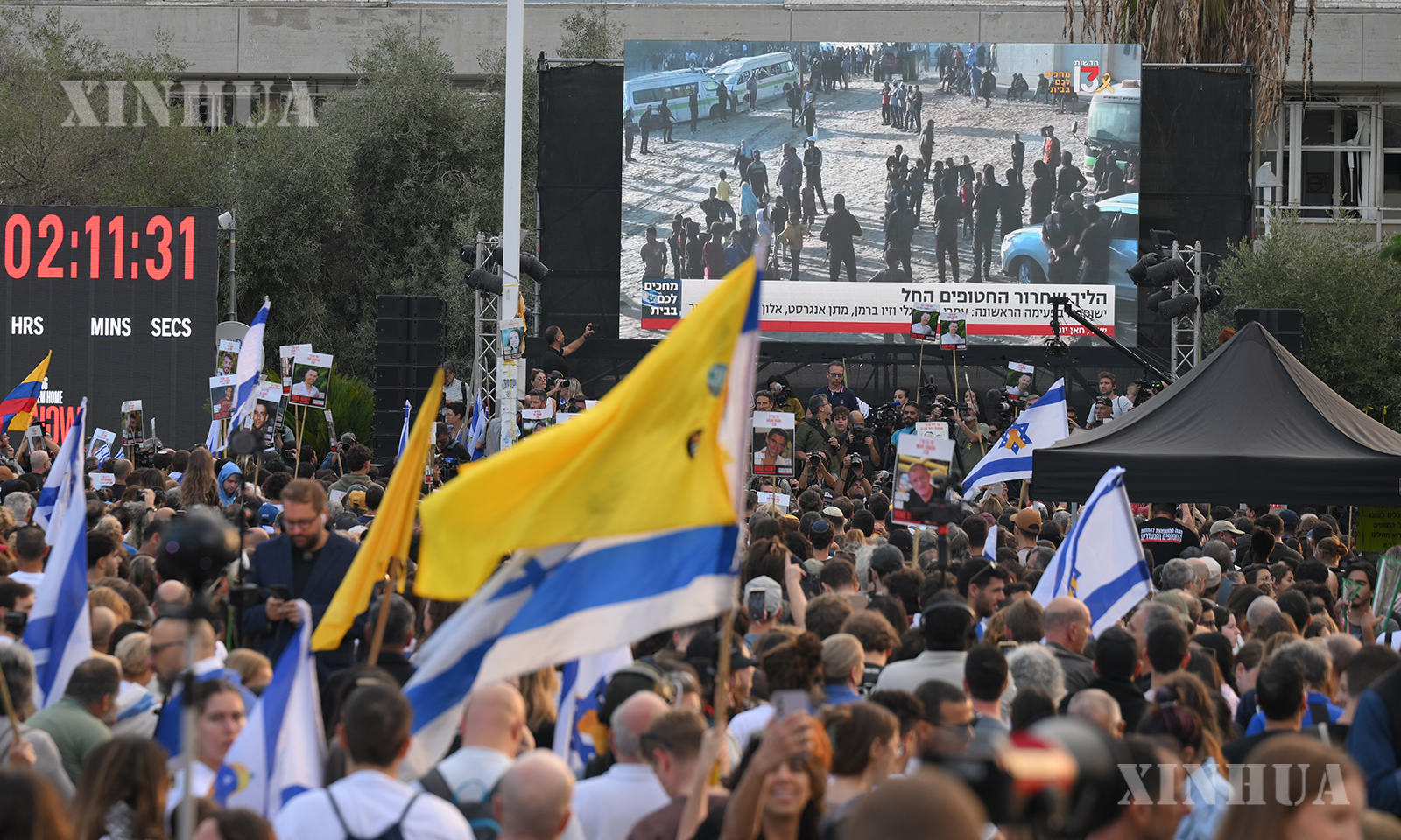 图说2:10月13日,在以色列特拉维夫,人们通过大屏幕观看被扣押人员释放直播。新华社发(贾马尔·阿瓦德摄)
