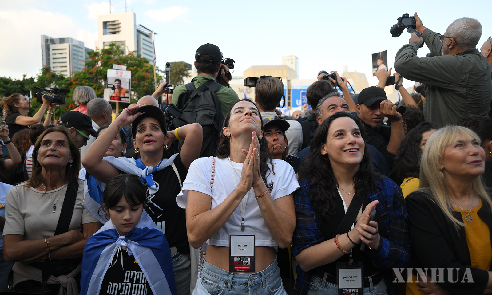 အစ္စရေးနိုင်ငံ Tel Aviv မြို့တွင် ပြည်သူများက ဖန်သားပြင်မှတစ်ဆင့် ဖမ်းဆီးထိန်းသိမ်းခံထားရသူများ လွှတ်ပေးသည့် တိုက်ရိုက်ထုတ်လွှင့်မှုအား ကြည့်ရှုနေသည်ကို ၂၀၂၅ ခုနှစ် အောက်တိုဘာ ၁၃ ရက်က တွေ့ရစဉ် (ဆင်ဟွာ)