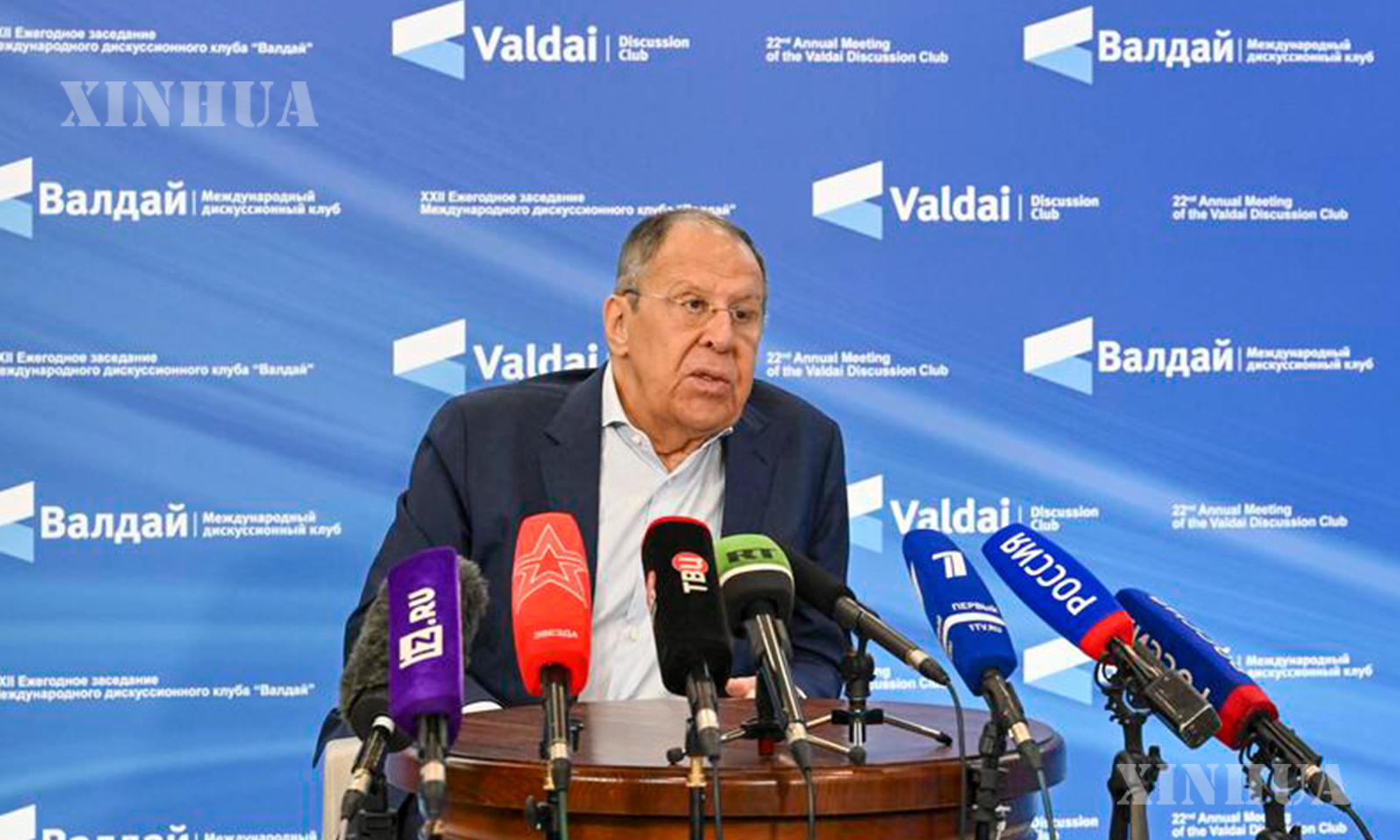 ရုရှားနိုင်ငံခြားရေးဝန်ကြီး ဆာဂေး လက်ဗ်ရော့ဗ်က ရုရှားနိုင်ငံ ဆိုချီမြို့၌ ကျင်းပသော Valdai Discussion Club ၂၂ ကြိမ်မြောက် နှစ်ပတ်လည်အစည်းအဝေးတွင် သတင်းထောက်များ၏ မေးမြန်းမှုအား ပြန်လည်ဖြေကြားနေသည်ကို ၂၀၂၅ ခုနှစ် စက်တင်ဘာ ၃၀ ရက်က တွေ့ရစဉ် (ဆင်ဟွာ)