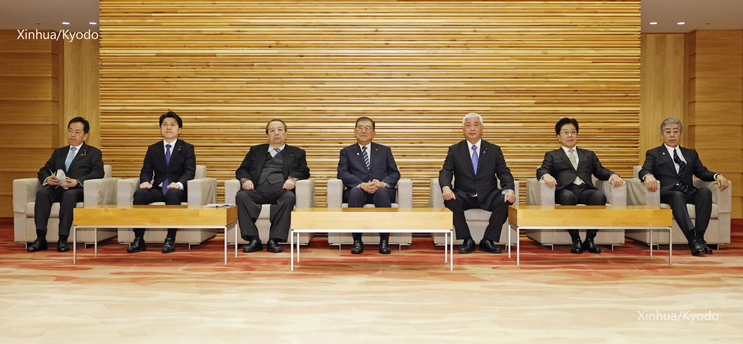 ဂျပန်နိုင်ငံ တိုကျိုမြို့ရှိ ဝန်ကြီးချုပ်အိမ်တော်တွင် ဂျပန်ဝန်ကြီးချုပ် ရှိဂဲရုအီရှီဘာ (အလယ်) နှင့် အစိုးရအဖွဲ့ဝင်များ အစိုးရအဖွဲ့ အစည်းအဝေးတက်ရောက်လာကြသည်ကို အောက်တိုဘာ ၂၁ ရက်က တွေ့ရစဉ် (ဓာတ်ပုံ- Xinhua/Kyodo)