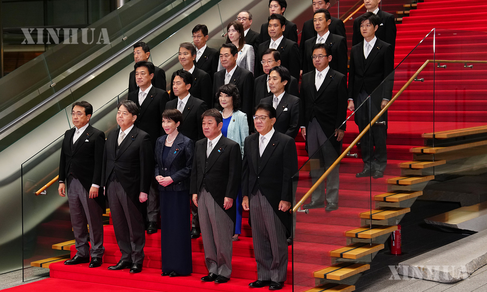 图说1:10月21日,日本首相高市早苗(前排中)在东京的首相官邸率阁僚合影。新华社记者 贾浩成 摄