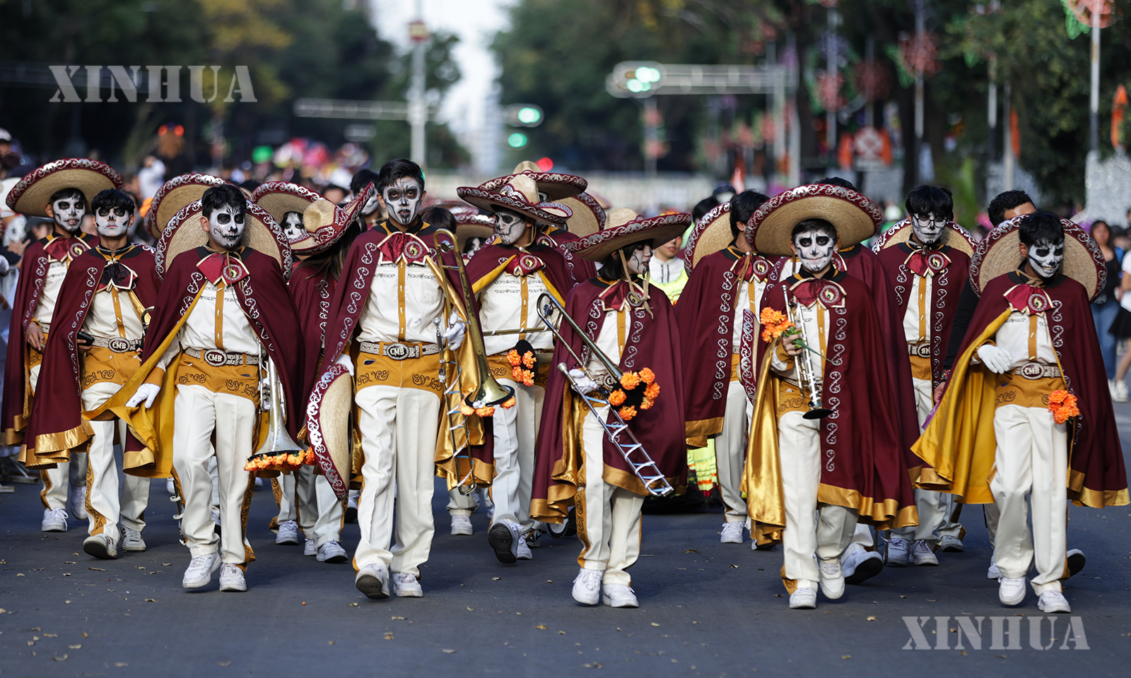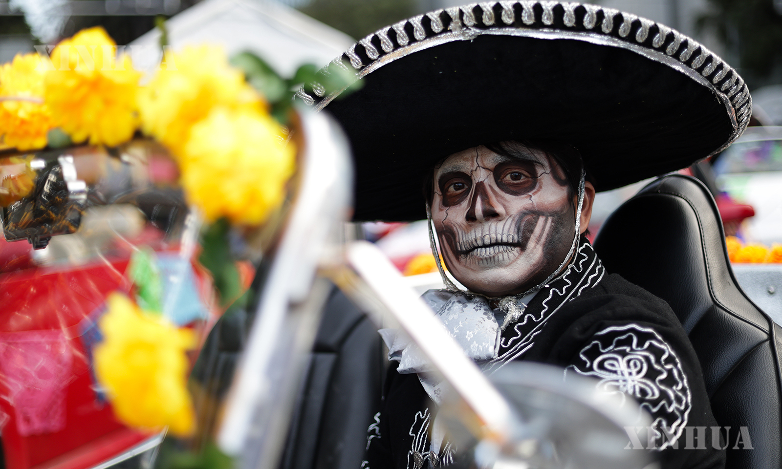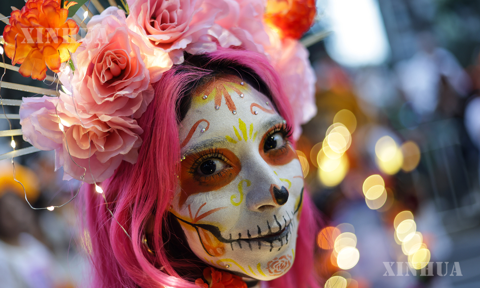 当日,墨西哥首都墨西哥城举办“卡特里娜游行”,迎接即将来临的亡灵节。每年的11月1日和2日是墨西哥的传统节日亡灵节。