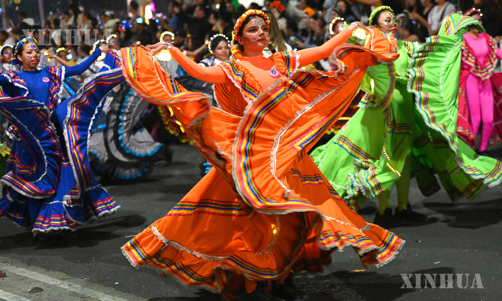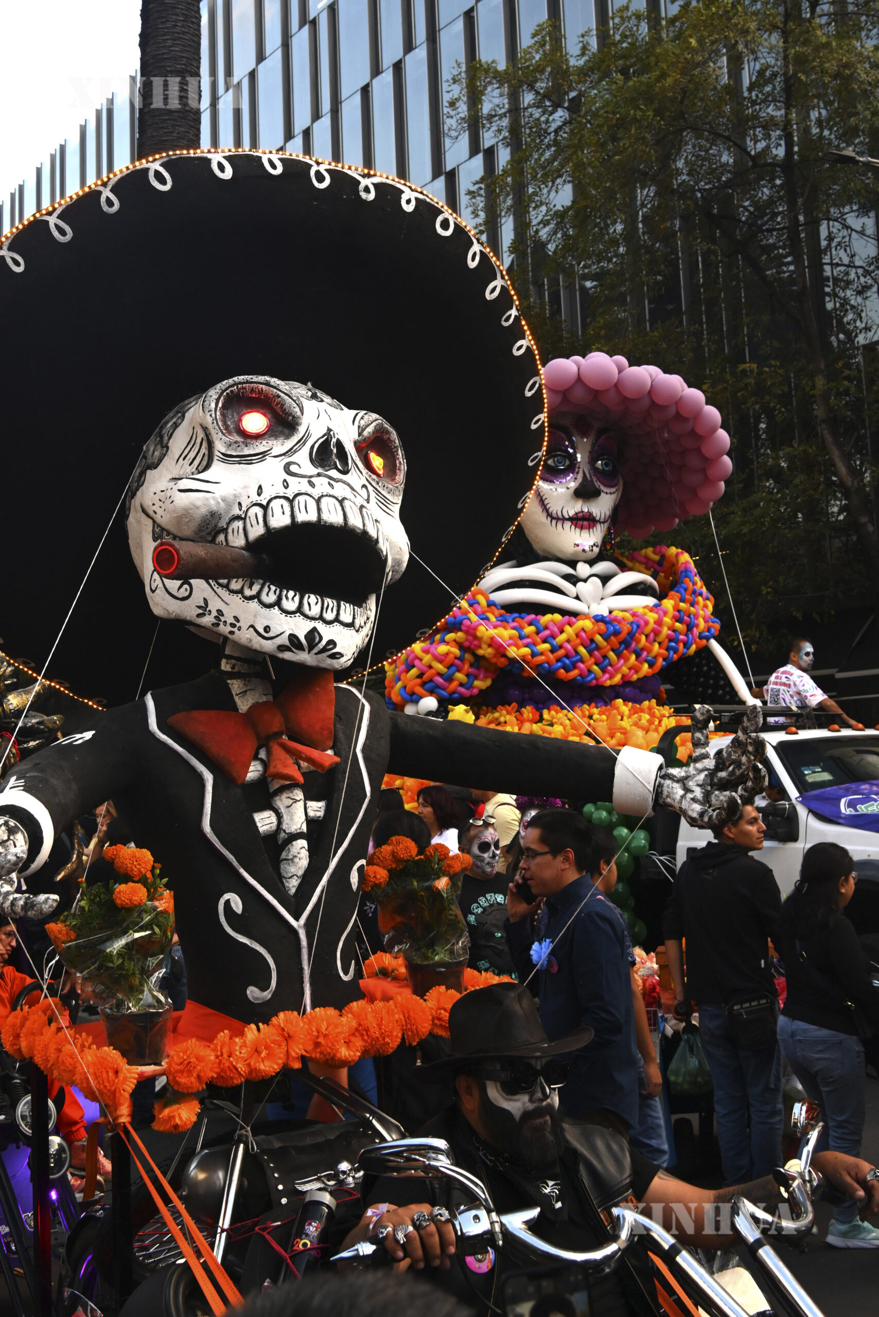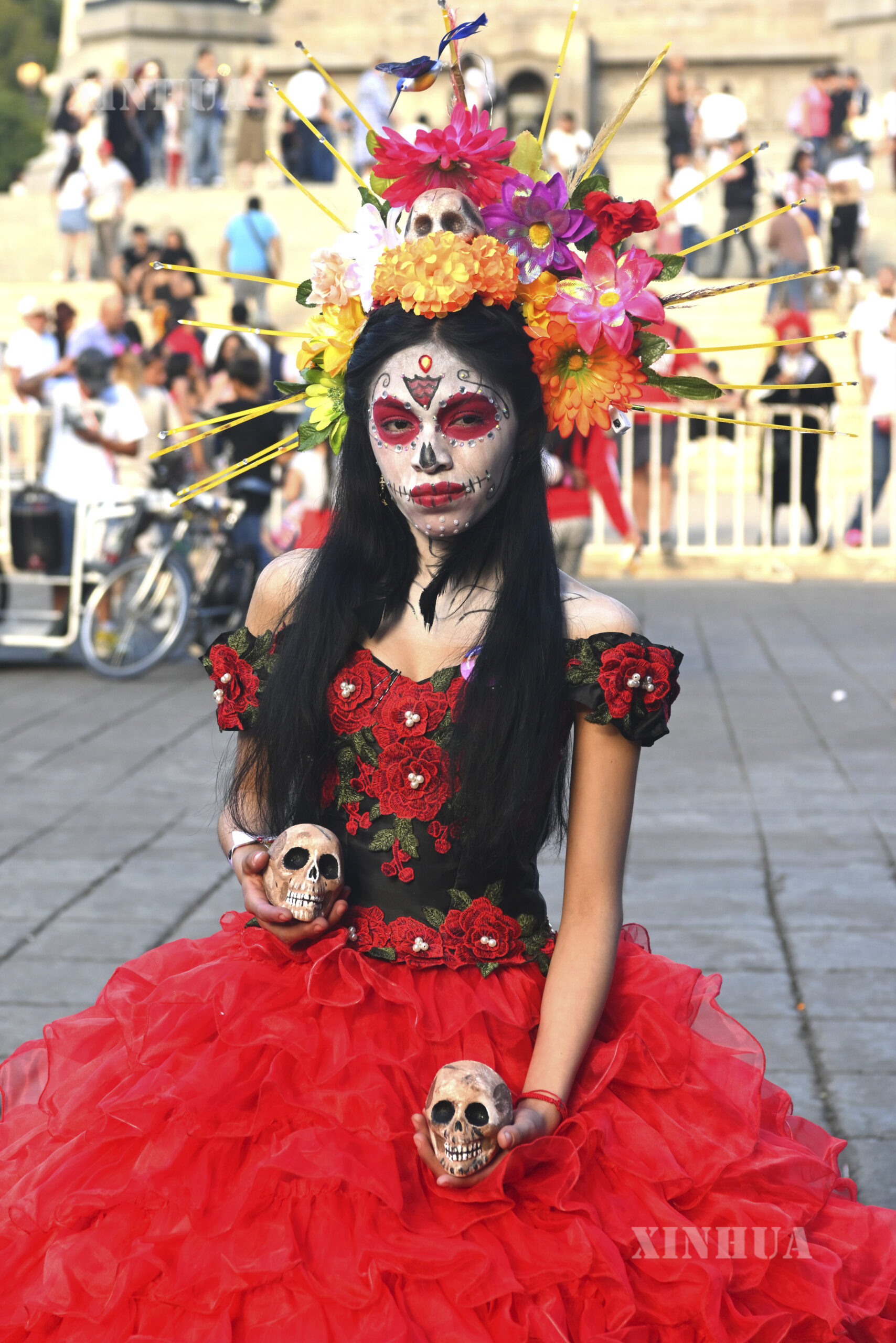 当日,墨西哥首都墨西哥城举办“卡特里娜游行”,迎接即将来临的亡灵节。每年的11月1日和2日是墨西哥的传统节日亡灵节。