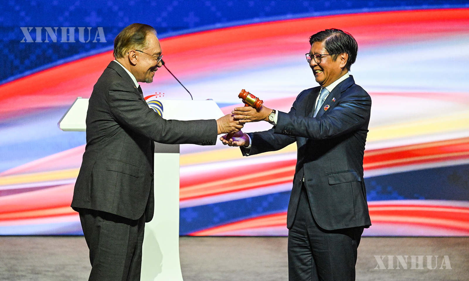 မလေးရှားနိုင်ငံ ကွာလာလမ်ပူမြို့၌ ကျင်းပသည့် ၄၇ ကြိမ်မြောက် အာဆီယံ ထိပ်သီးအစည်းအဝေးနှင့် ဆက်စပ်အစည်းအဝေး ပိတ်ပွဲအခမ်းအနားတွင် မလေးရှားနိုင်ငံ ဝန်ကြီးချုပ် အန်ဝါ အီဘရာဟင် (ဝဲဘက်) က အလှည့်ကျဥက္ကဋ္ဌနိုင်ငံ သစ်သားတူအား ၂၀၂၆ ခုနှစ် အာဆီယံ အလှည့်ကျဥက္ကဋ္ဌနိုင်ငံ၊ ဖိလစ်နိုင်ငံ သမ္မတ မားကို့စ်ထံ လွှဲပြောင်းပေးနေသည်ကို ၂၀၂၅ ခုနှစ် အောက်တိုဘာ ၂၈ ရက်က တွေ့ရစဉ် (ဆင်ဟွာ)