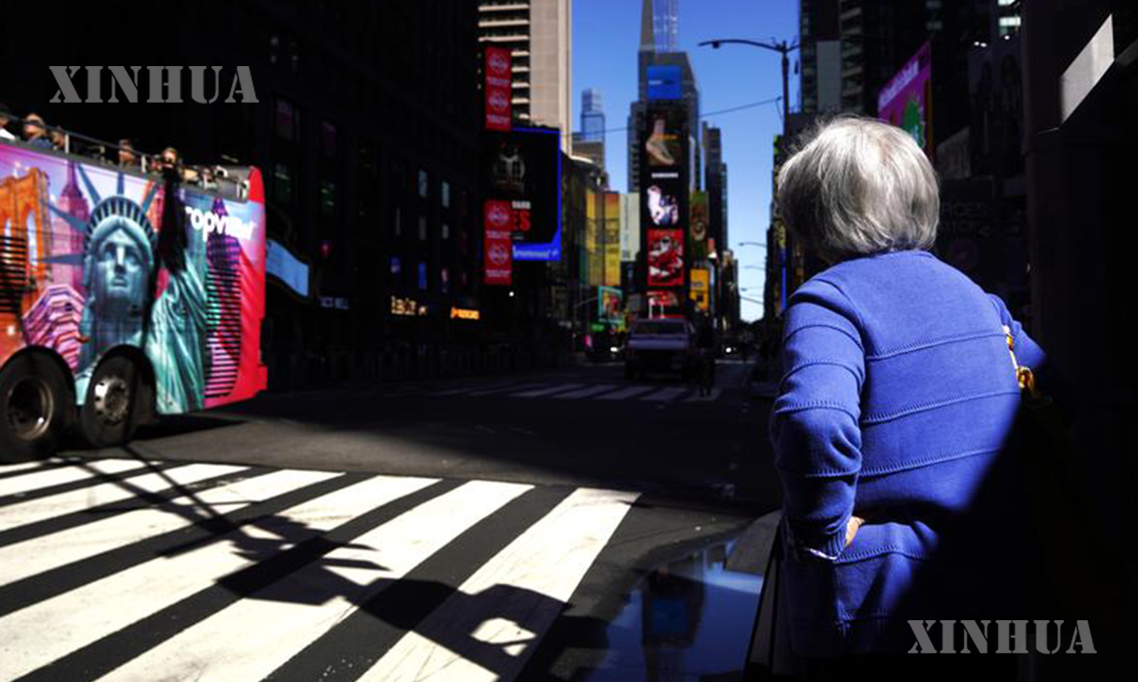 အမေရိကန်နိုင်ငံ နယူးယောက်မြို့ မန်ဟက်တန်ရှိ Times Square အနီးတွင် လူကူးမျဉ်းကြားကူးရန် စောင့်ဆိုင်းနေသူအား ၂၀၂၅ ခုနှစ် အောက်တိုဘာ ၁ ရက်က တွေ့ရစဉ် (ဆင်ဟွာ)