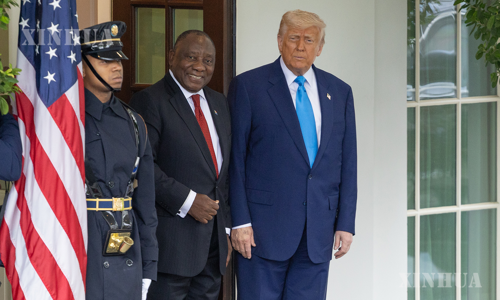图说:5月21日,美国总统特朗普(右)在华盛顿白宫迎接到访的南非总统拉马福萨(中)。新华社记者胡友松摄