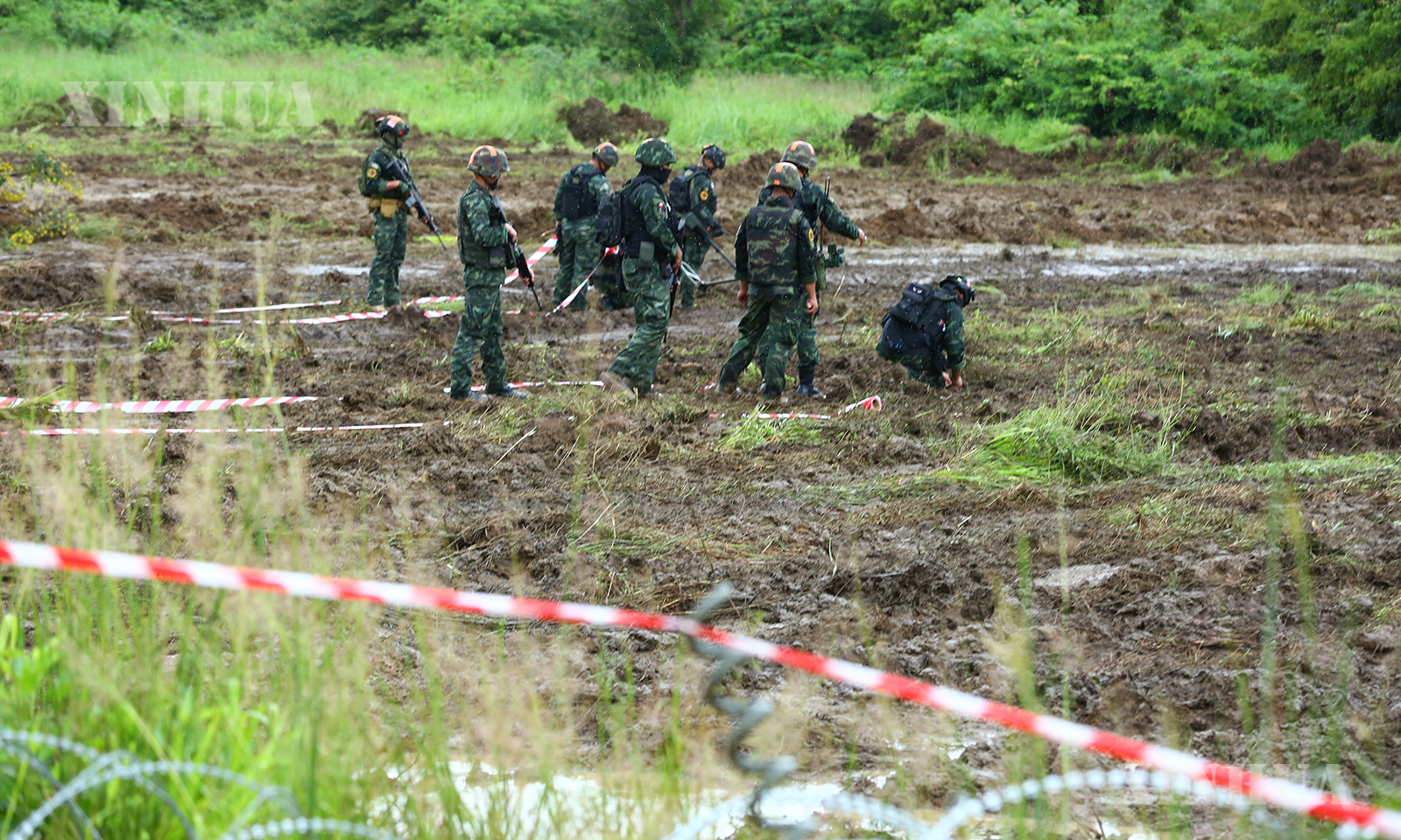 图说:10月10日,在泰国沙缴府,泰军士兵在泰柬边境区域进行排雷作业。新华社记者 孙玮彤 摄