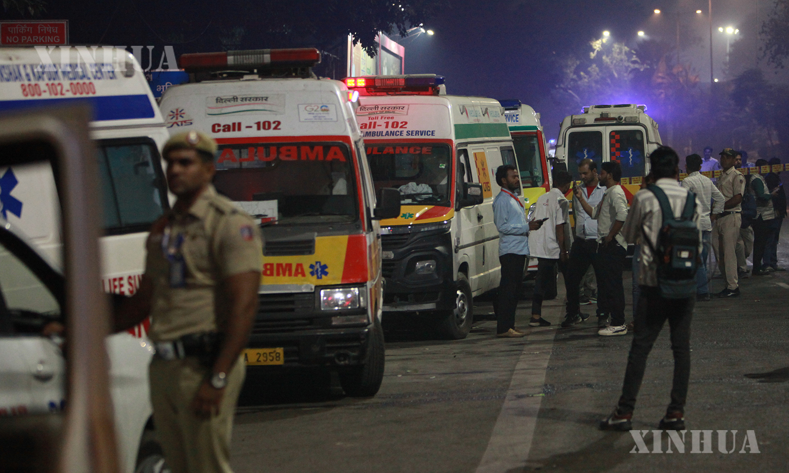 အိန္ဒိယနိုင်ငံ မြို့တော်နယူးဒေလီတွင် မော်တော်ကားပေါက်ကွဲမှု ဖြစ်ပွားရာနေရာသို့ လူနာတင်ကားများ ရောက်ရှိလာသည်ကို နိုဝင်ဘာ ၁၀ ရက်က တွေ့ရစဉ် (ဆင်ဟွာ)