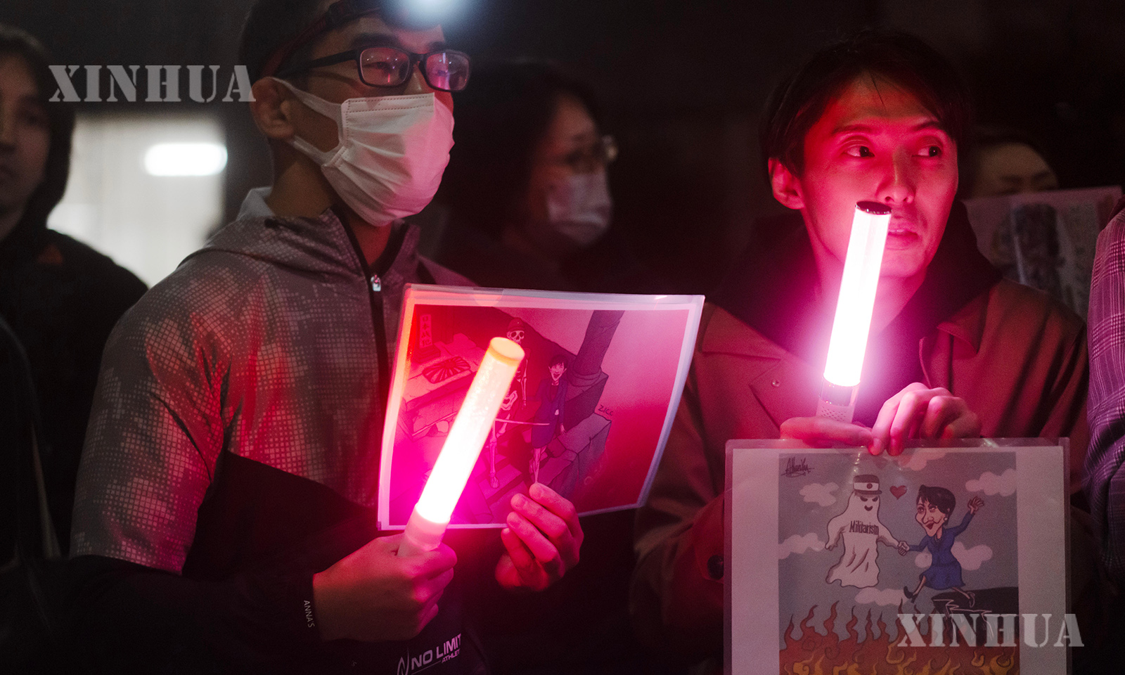图说:11月28日,民众在日本东京的首相官邸外参加抗议活动。新华社记者 贾浩成 摄