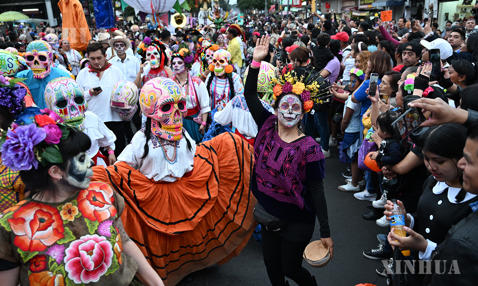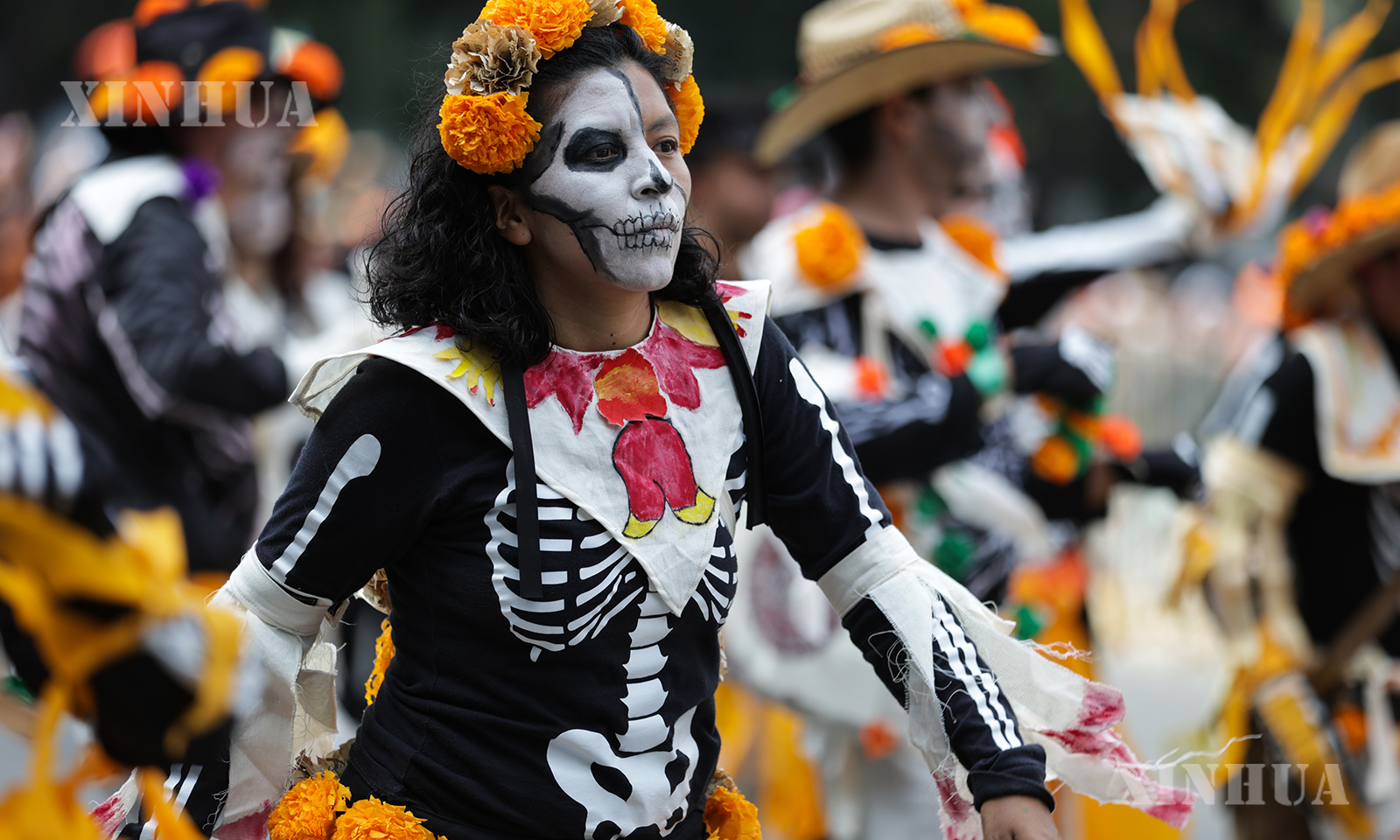 图说1:11月1日,在墨西哥首都墨西哥城,演员参加亡灵节游行。 新华社记者 李梦馨 摄
