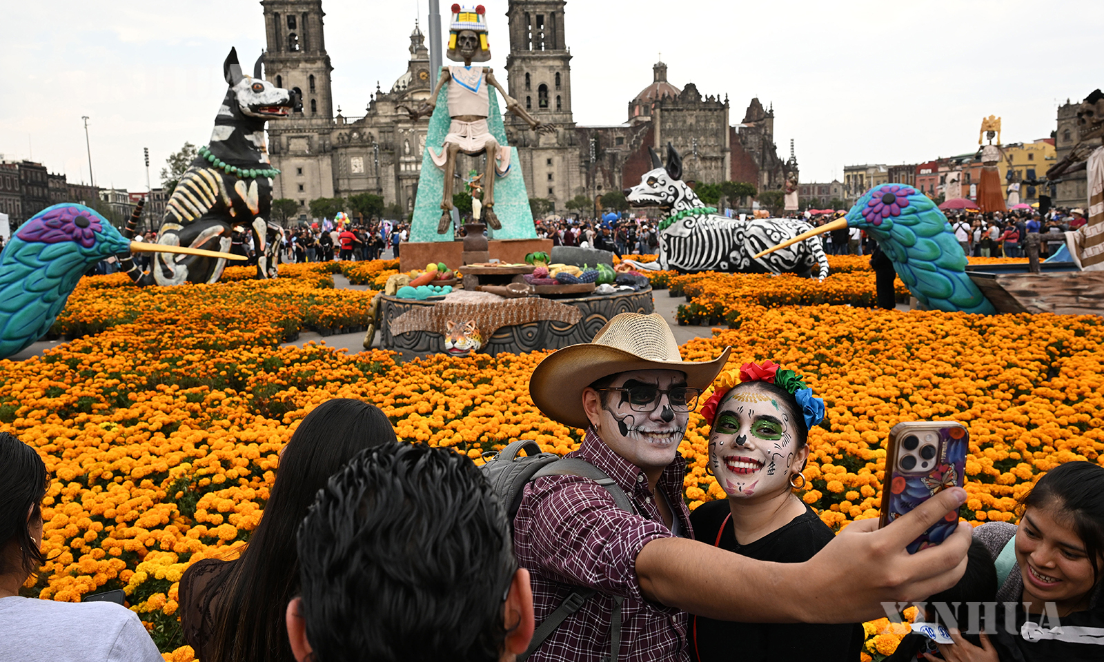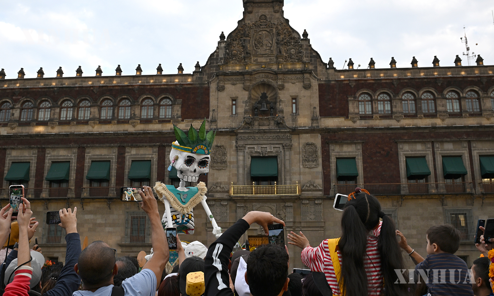 မက္ကဆီကိုနိုင်ငံ မက္ကဆီကိုစီးတီးမြို့တွင် ကွယ်လွန်သူများနေ့ (Day of the Dead) လှည့်လည်ပွဲအား ကြည့်ရှုနေသော ပြည်သူလူထုများ ဓာတ်ပုံရိုက်ကူးနေကြသည်ကို အောက်တိုဘာ ၁ ရက်က တွေ့ရစဉ် (ဆင်ဟွာ)