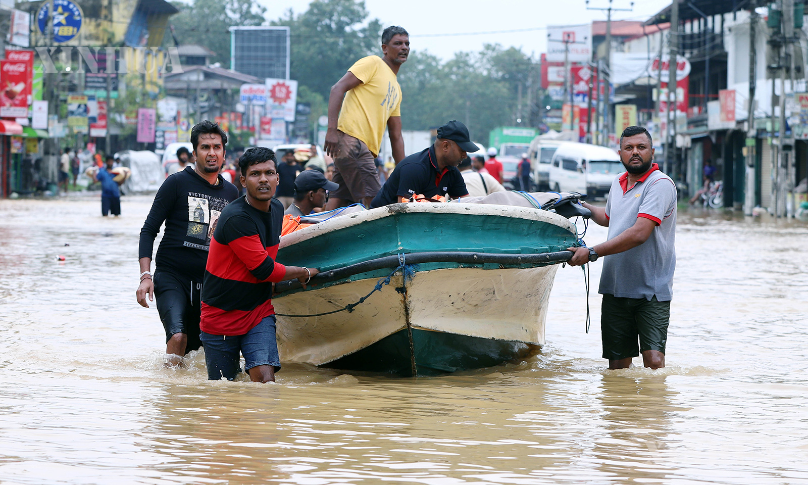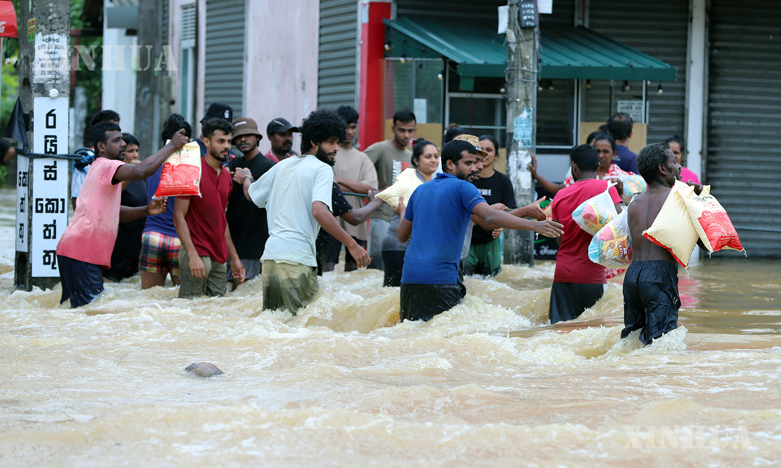 သီရိလင်္ကာနိုင်ငံ မြို့တော်ကိုလံဘိုရှိ ဆင်ခြေဖုံး၌ ဒေသခံများက လှေစီး၍ ဘေးဒဏ်သင့်ဒေသမှ ထွက်ခွာနေသည်ကို ၂၀၂၅ ခုနှစ် နိုဝင်ဘာ ၂၉ ရက်က တွေ့ရစဉ် (ဆင်ဟွာ)
